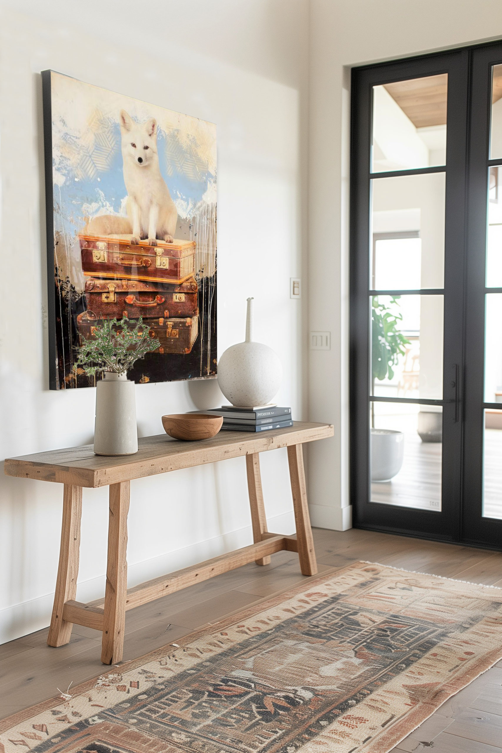KOLLABS’ “Lilly” adds a playful pop to the entryway, instantly catching the eye with its arctic fox perched proudly atop a stack of vintage suitcases. The soft blue-and-white sky behind it brings in a breezy, lighthearted feel, balancing the whimsy with a touch of calm. It’s a piece that makes a stylish hello while filling the space with charm and imagination.