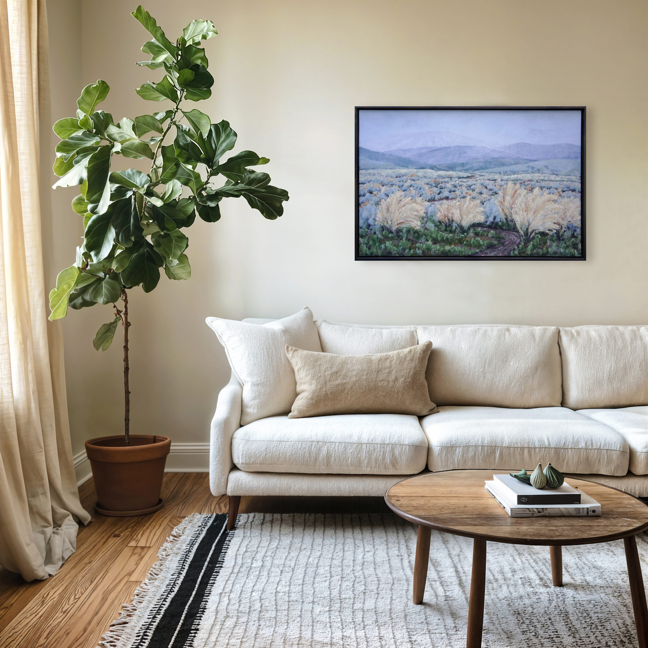 Bridgette Meinhold’s cold wax painting “Trailside” washes the space in a dreamy calm. In the painting, the softened horizon blurs sky and land together, its hazy periwinkle sky drifting seamlessly into the mountain and meadow below, creating an atmosphere that feels both expansive and intimate. Above the couch in this warm living room, the painting brings a quiet, ethereal quality that invites pause and reflection.