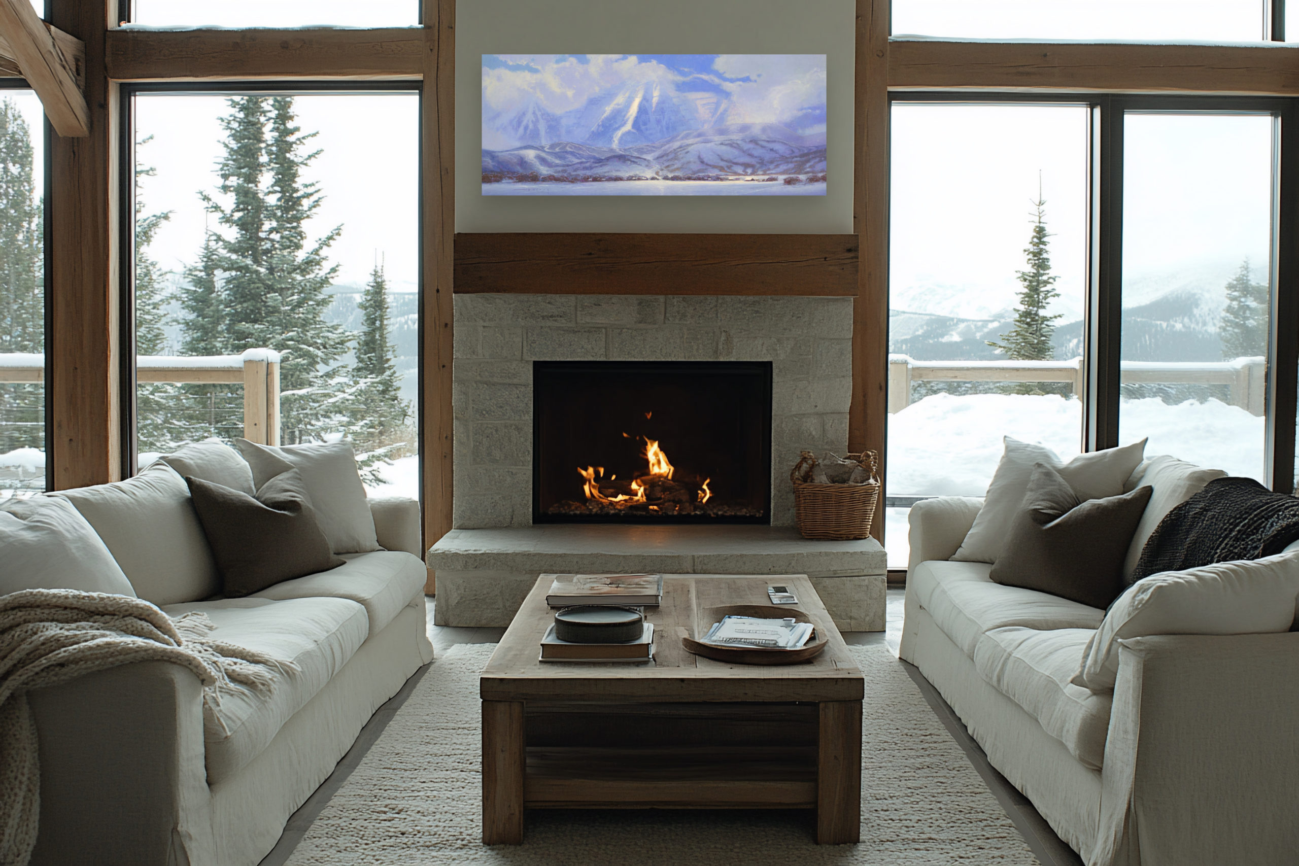 Warren Neary’s painting “Celestial Ascension” brings a sense of grandeur to this luxury living room with its towering clouds and majestic mountains. The dramatic interplay of light and atmosphere gives the scene both weight and lift, as though the mountains themselves are reaching toward the heavens. Positioned above the fireplace, this piece adds a luminous reminder of the sky’s power to transform even the most rugged of landscapes.