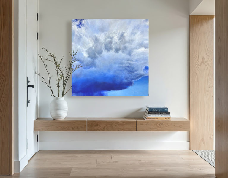 Peter Roux’s “Suspension” brings a sense of dynamic energy to the simple entryway, its cobalt blues and soft whites evoking clouds drifting across an open sky. The painting captures the shifting atmosphere with subtle drama, offering a quiet reminder of the beauty found overhead. We love how its presence adds a grounded yet airy balance to the space.