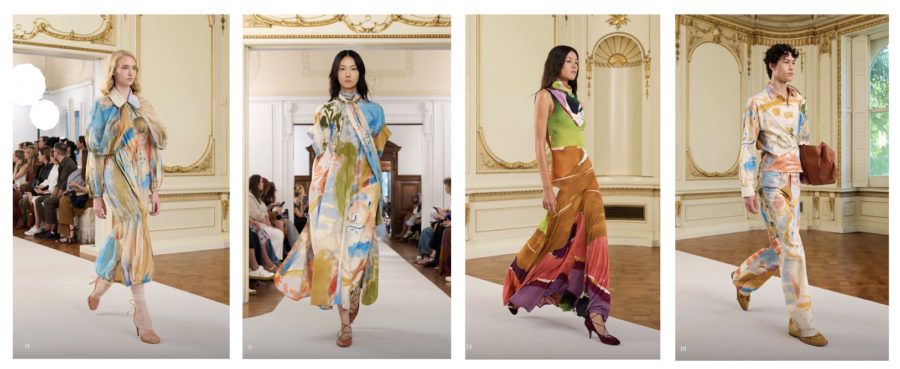 Across the ocean, Ulla Johnson offered a softer meditation at New York’s Cooper Hewitt Museum. In collaboration with the Helen Frankenthaler Foundation, her Spring collection flowed with painterly abstraction — gradients and color fields that translated Frankenthaler’s soak-stain technique into light as air silk and chiffon. A recording of the artist’s voice played during the show, underscoring the dialogue between garment and canvas. Here, art was not backdrop but lifeblood: the brushstroke became fabric, the painting became movement. These pieces are wearable and collectable: the perfect fusion of art and fashion.