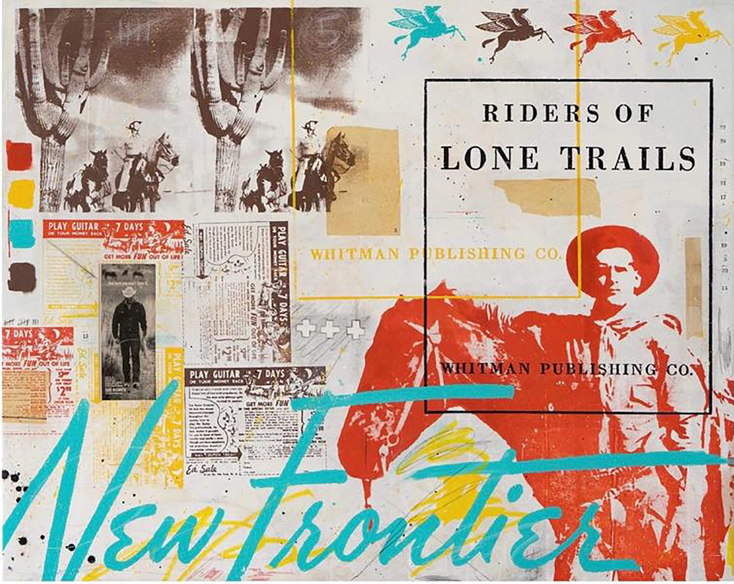 Mixed-media artist Miles Glynn brings a modern, narrative energy to his equine imagery. Drawing on his experiences traveling across the American West, he layers collage, paint, and silkscreen to create horses that feel both iconic and personal. Infused with elements of pop art—bold color, graphic forms, and playful compositions—Glynn’s work evokes the cinematic sweep of Western landscapes, presenting horses as living characters within a story that blends history, memory, and imagination.