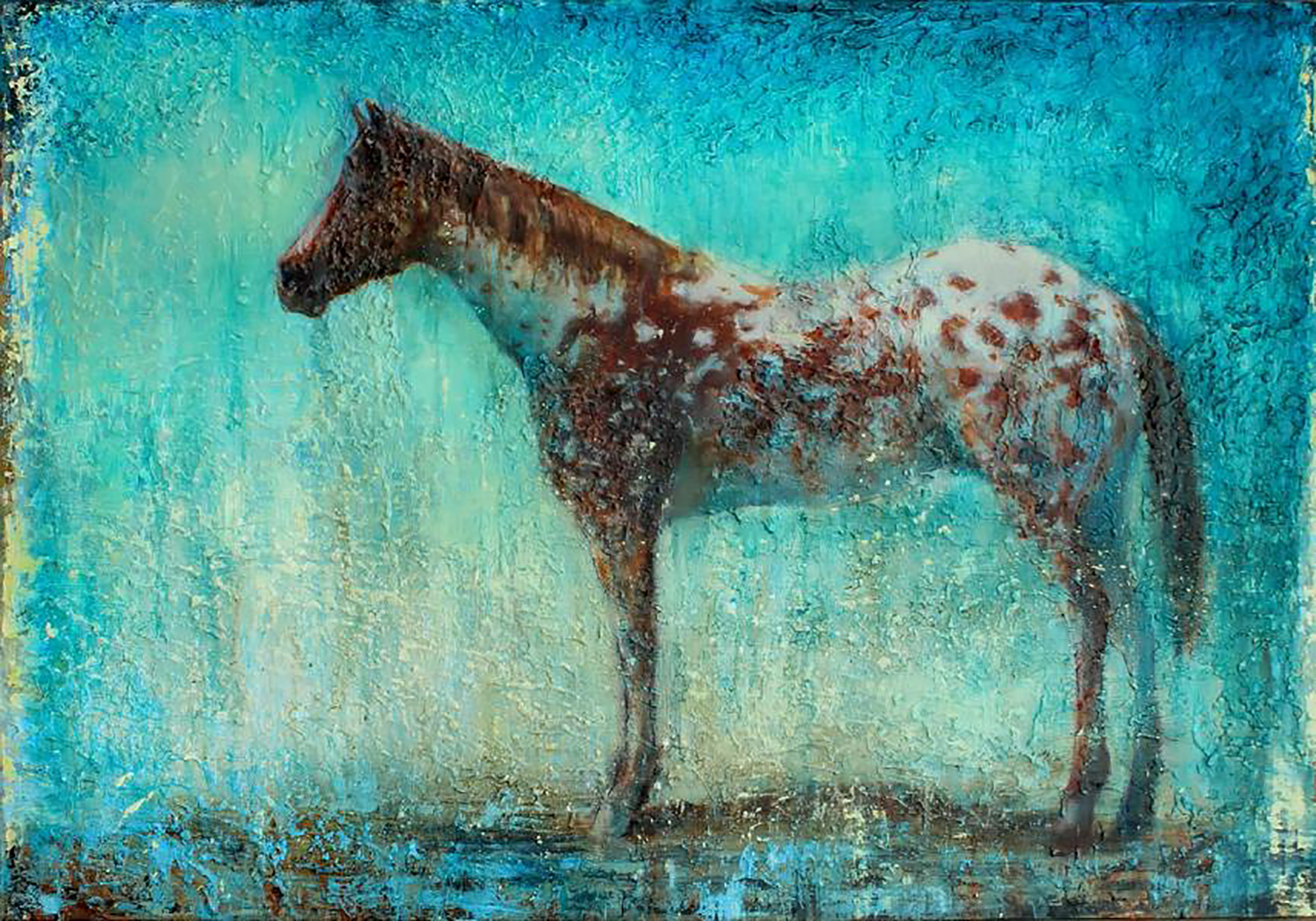 Meanwhile, Matt Flint’s mixed-media horses seem to emerge from mist and memory. His surfaces are built through washes, scratches, and reworked marks, suggesting horses shaped by history and the land itself. The effect is hauntingly beautiful – his horses appear as both spirit and shadow, tethered to time yet moving through it.