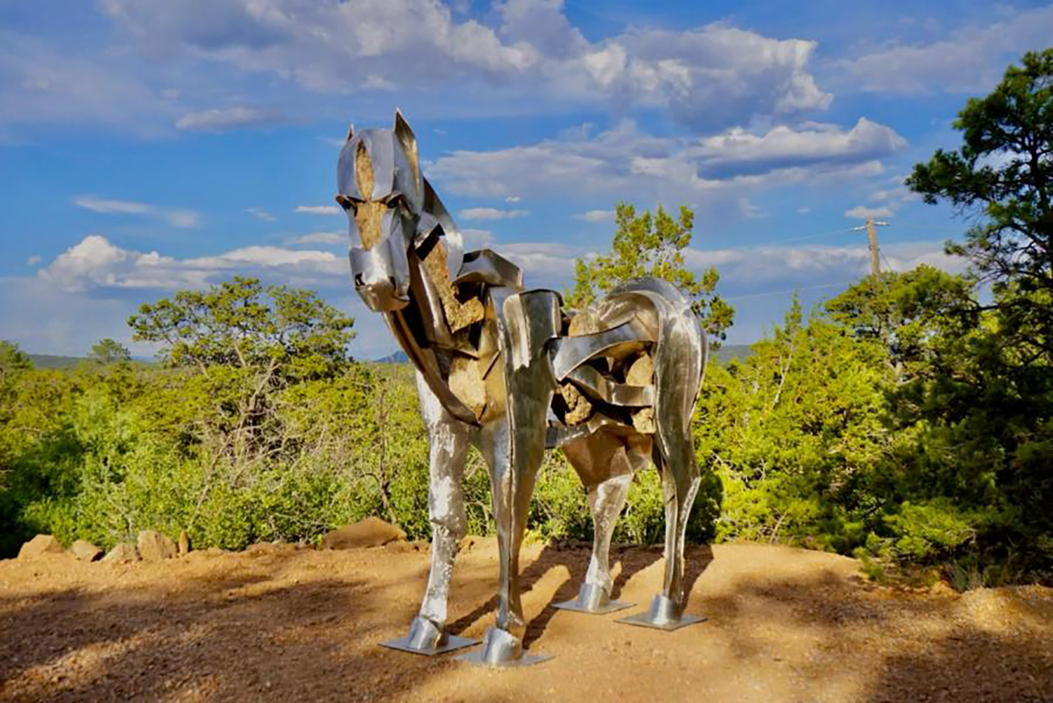 Sculptor Jamie Burnes transforms found steel, wood, and stone into powerful equine forms. His horses combine strength and grace, with rusted steel and weathered wood creating a sense of movement and presence. By blending natural and industrial materials, Burnes gives his work a timeless quality, where each horse feels both grounded in the earth and alive with energy.
