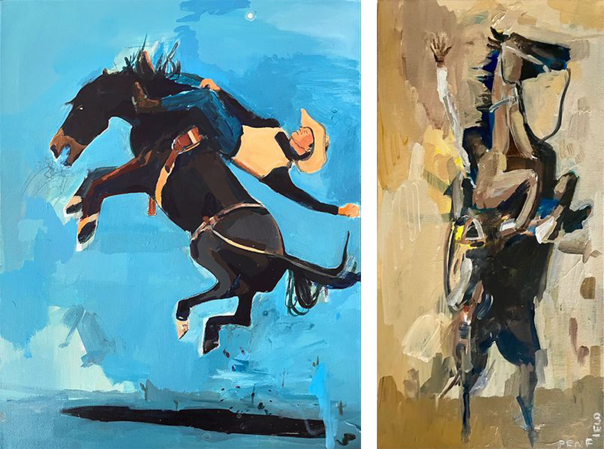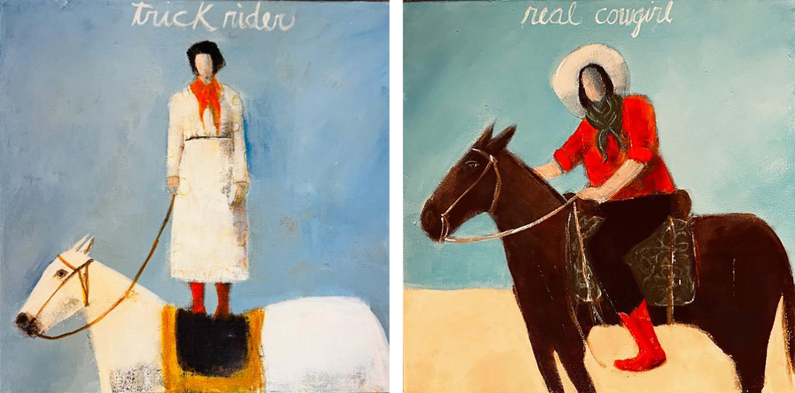 Left to Right: Mary Scrimgeour, “Trick Rider,” mixed media, 12″ x 12″ | Mary Scrimgeour, “Real Cowgirl,” mixed media, 12″ x 12″
