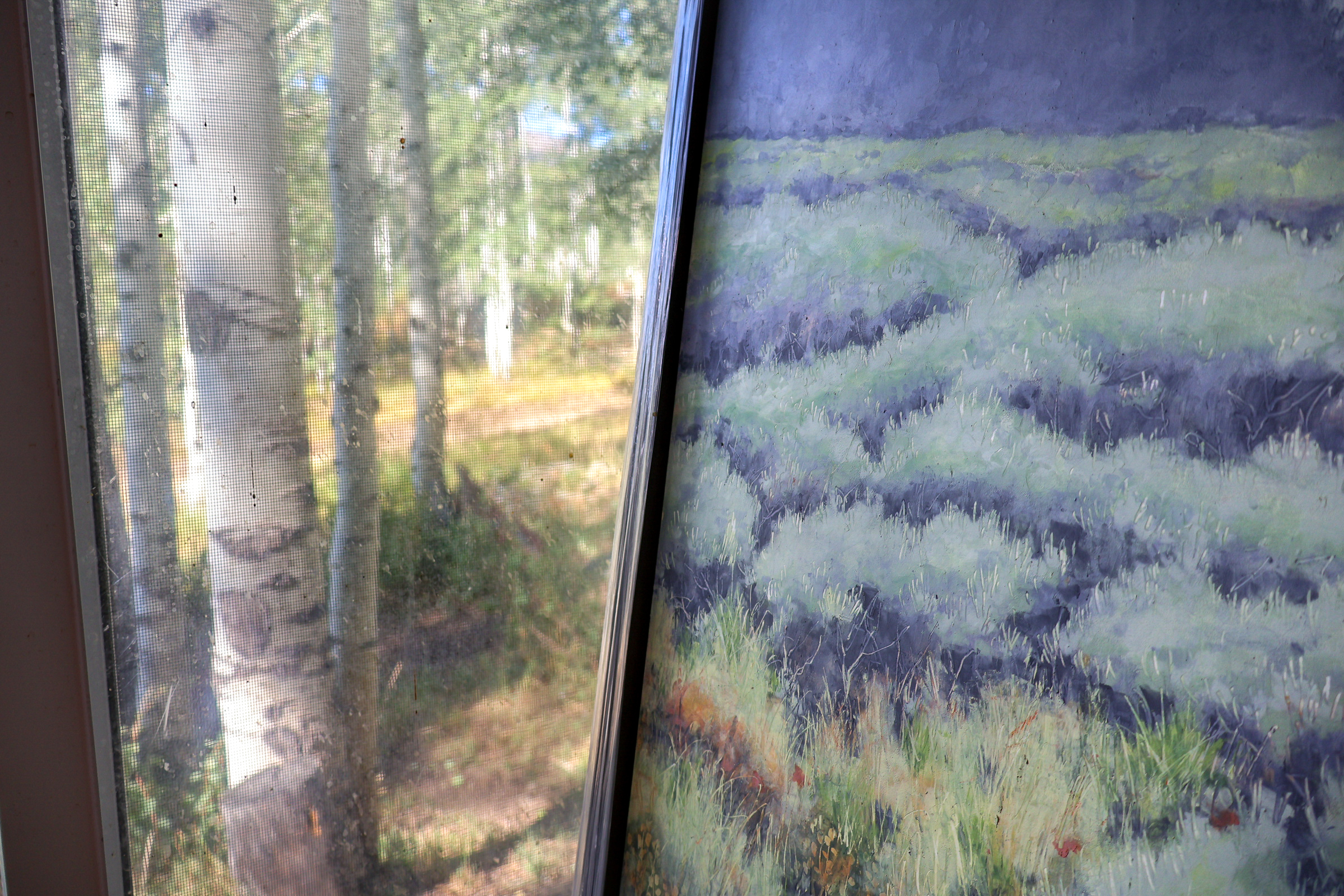 A detailed shot of Meinhold’s cold wax work “Let Me Drink the Day” next to the aspen tree view outside her studio window