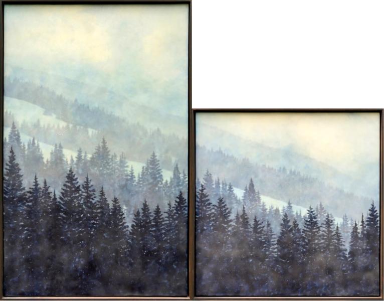 Bridgette Meinhold: Every new painting I make builds upon the last painting I made. Each one is part of a long evolution of learning, experimenting, improving, and changing. I think collectors will see a lot of my history in these paintings, what I am most known for – my atmospheric landscapes, but there’s a twist. I’m looking at old ideas from a new angle, perhaps from a different window of the same house. I’ve also done a number of diptychs and triptychs before, but these new groupings are really interesting to me, and I liked playing around with how I could envision windows in a house looking out onto a landscape. I hope to do more like these – ensuring that each panel is its own painting that could be viewed on its own, but is part of a larger whole. Also, there’s a fair bit of color, which has been a lot of fun and exciting for me.