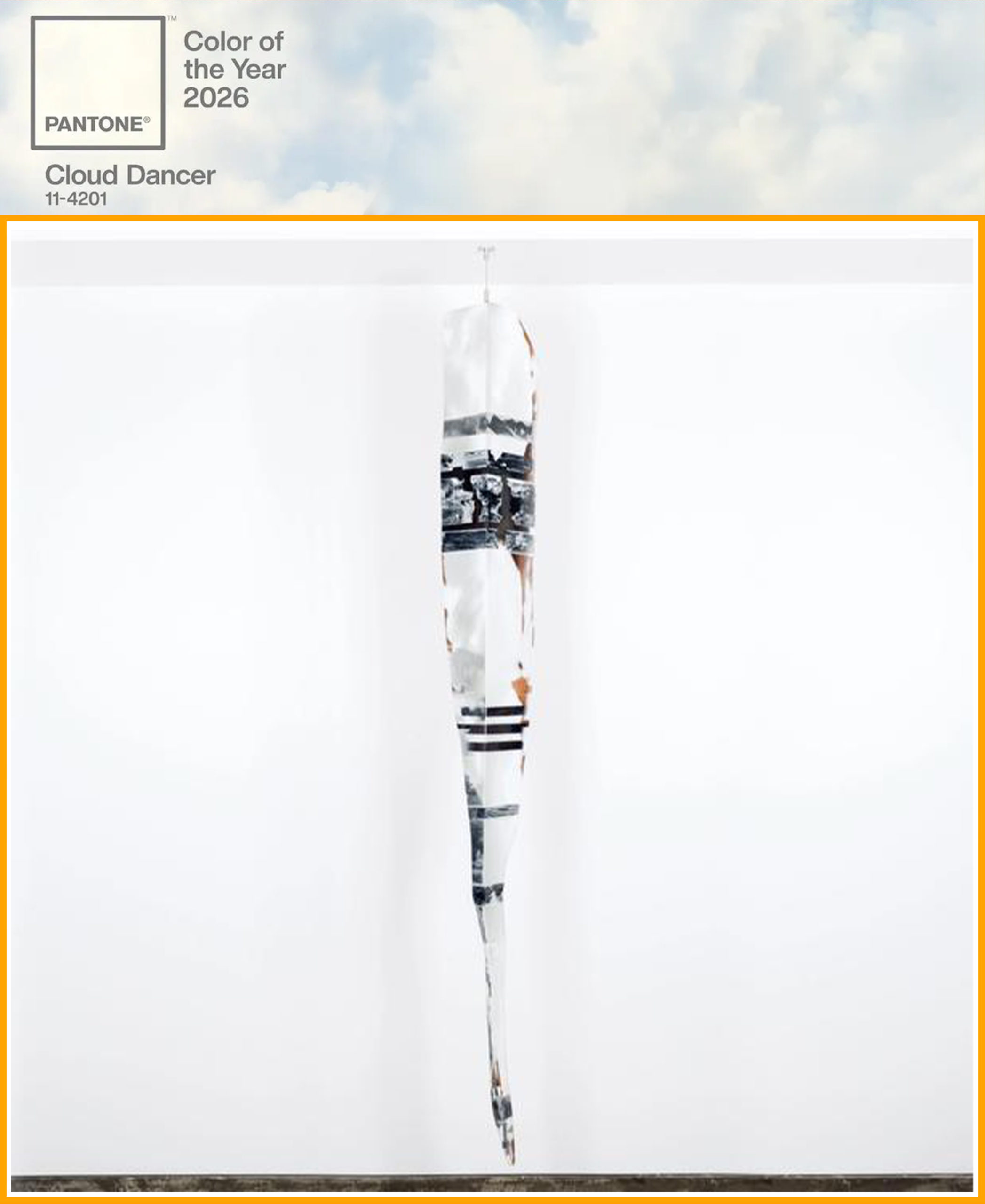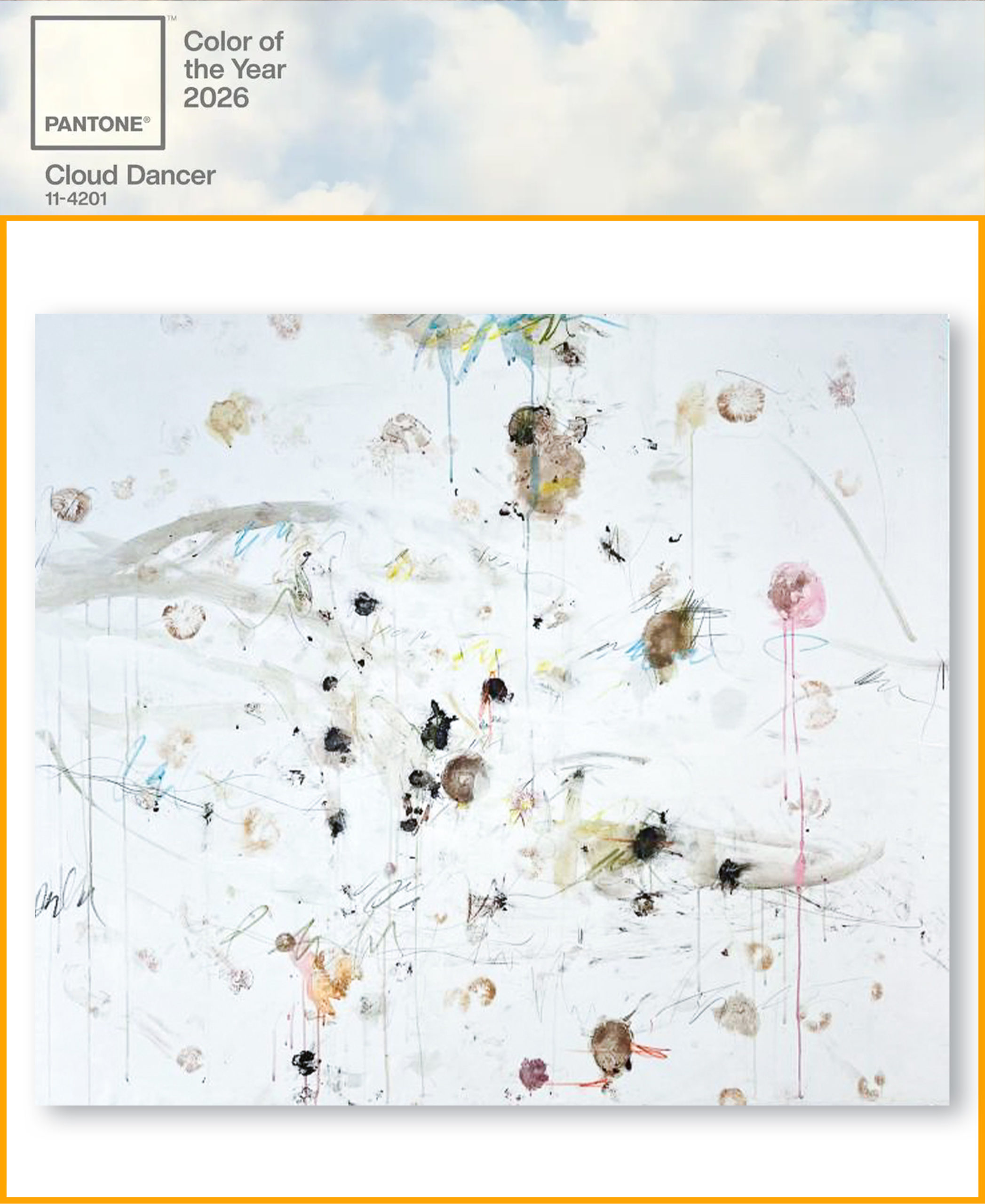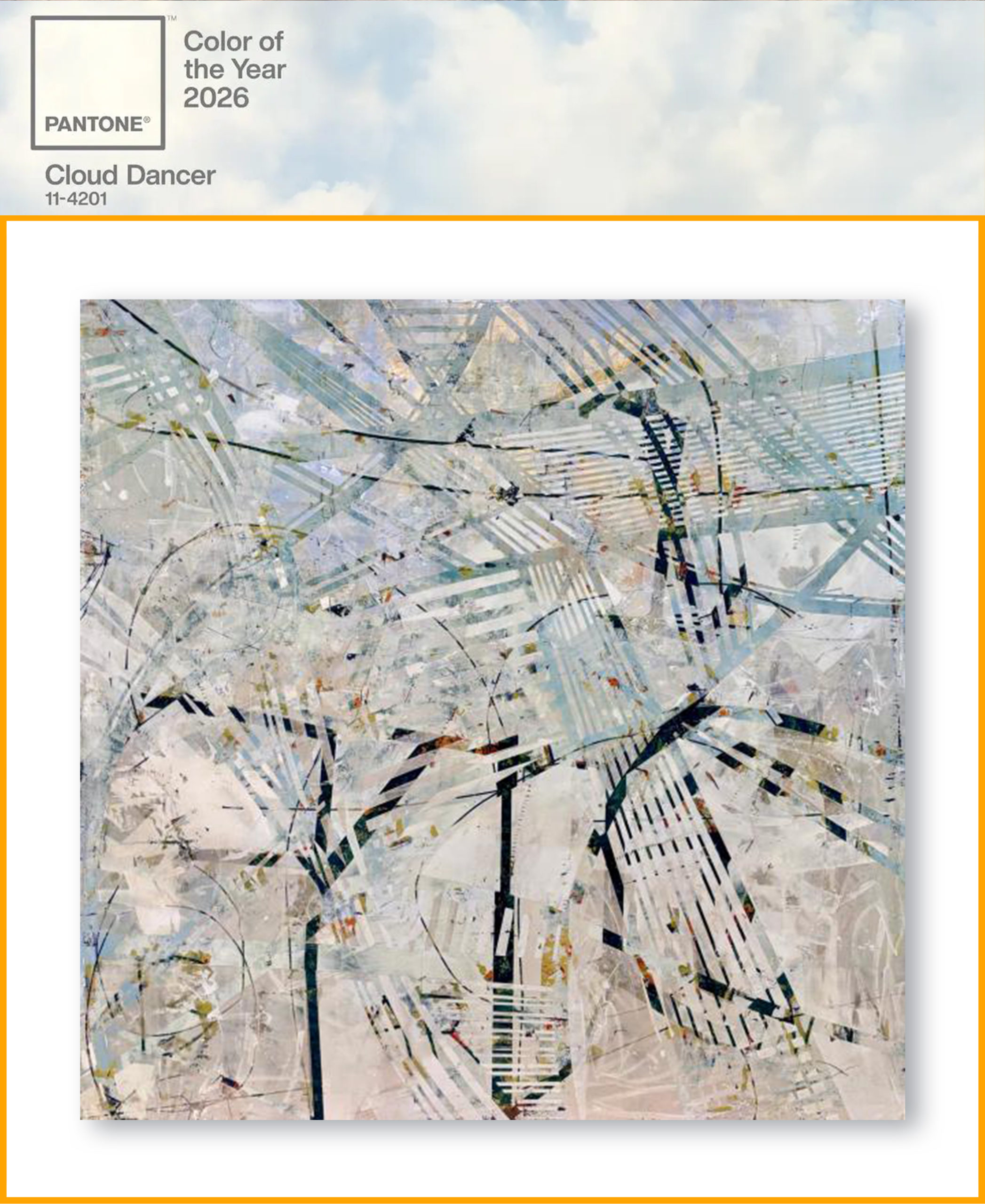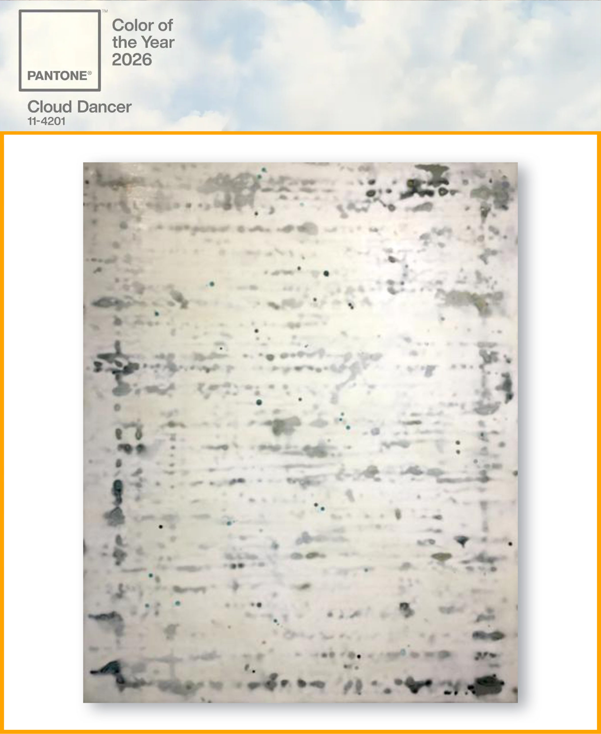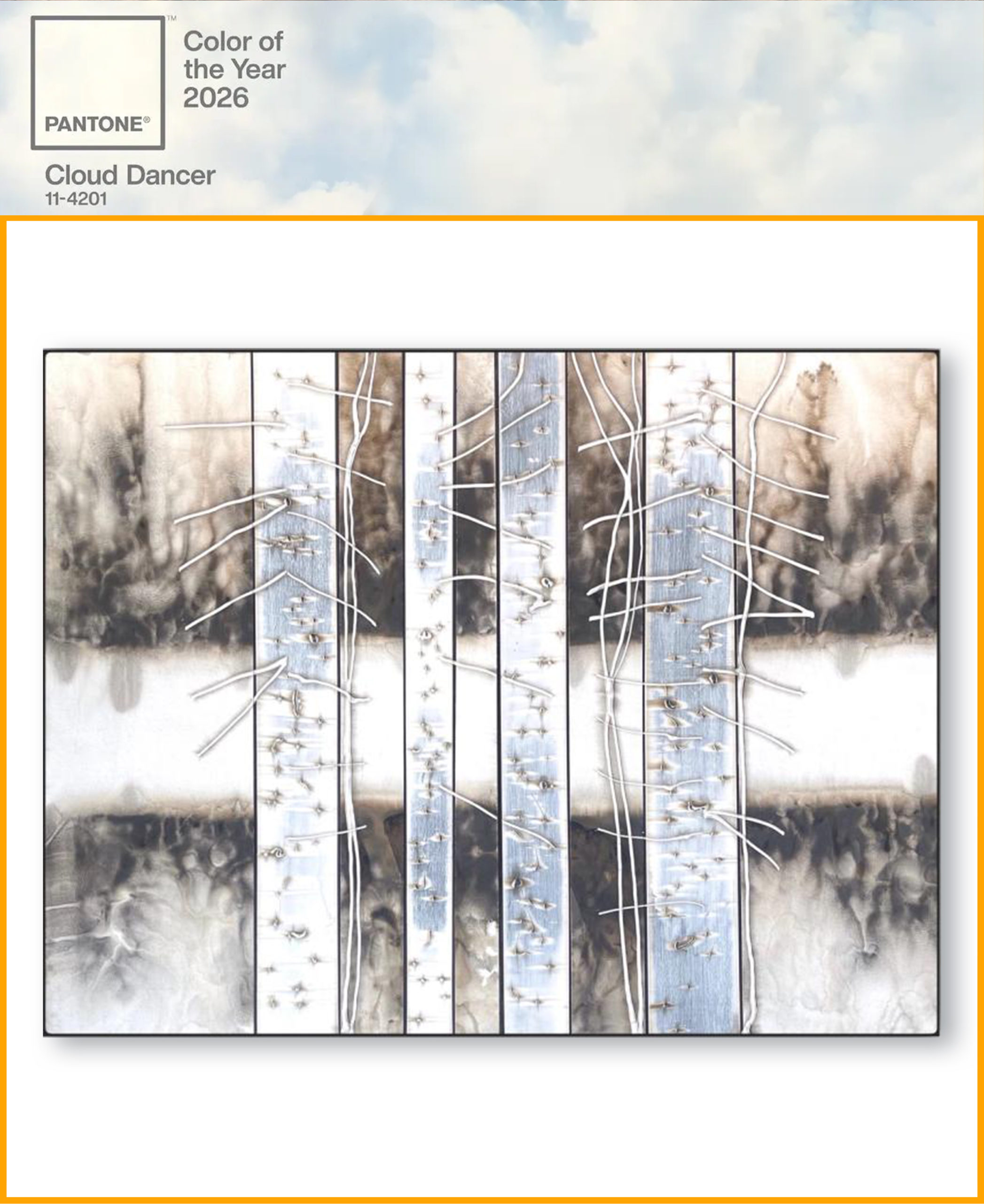 Cloud Dancer white weaves through the varied textures of Michael Kessler’s “Quiversticks (15),” softening contrasts and harmonizing the layered grays, browns, and subtle blue-gray accents. Its presence lends the composition a sense of calm cohesion, reinforcing the color’s association with clarity, restraint, and the natural world.