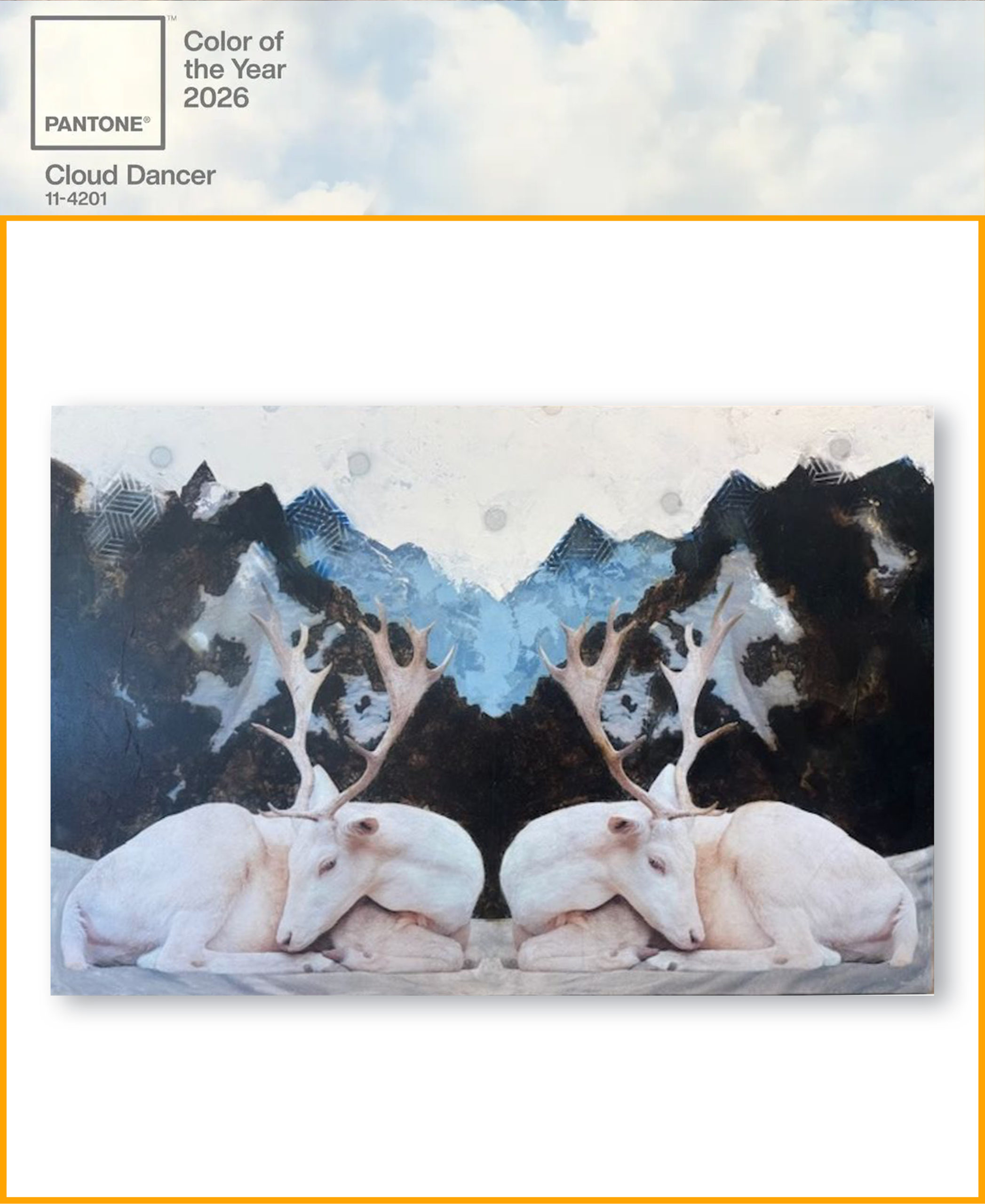 Cloud Dancer white plays a quietly symbolic role in KOLLABS’ “Twin Peaks,” defining the presence of the paired deer with a sense of stillness and restraint. Set against stark black mountain peaks and glacial blues, the softened white introduces clarity and balance, acting as it a pause between opposing forces.