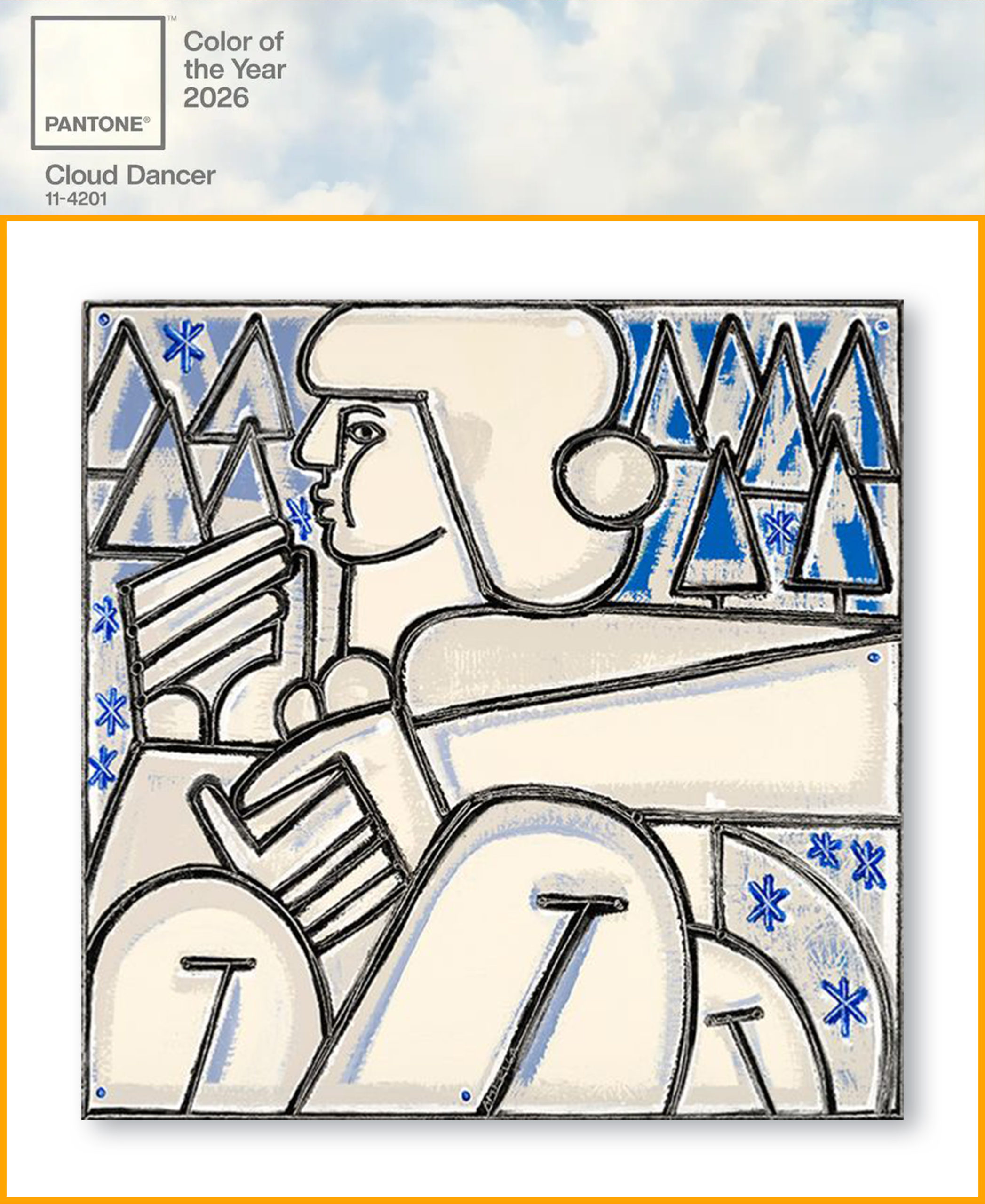 In America Martin’s “Cedar Tub & First Snowfall,” Cloud Dancer white captures the quiet luminosity of freshly fallen snow, amplifying the crisp contrast of blue and black in the piece. The soft white conveys both stillness and clarity, highlighting the composition’s delicate contour lines while reflecting the color’s symbolism of openness, balance, and thoughtful renewal.