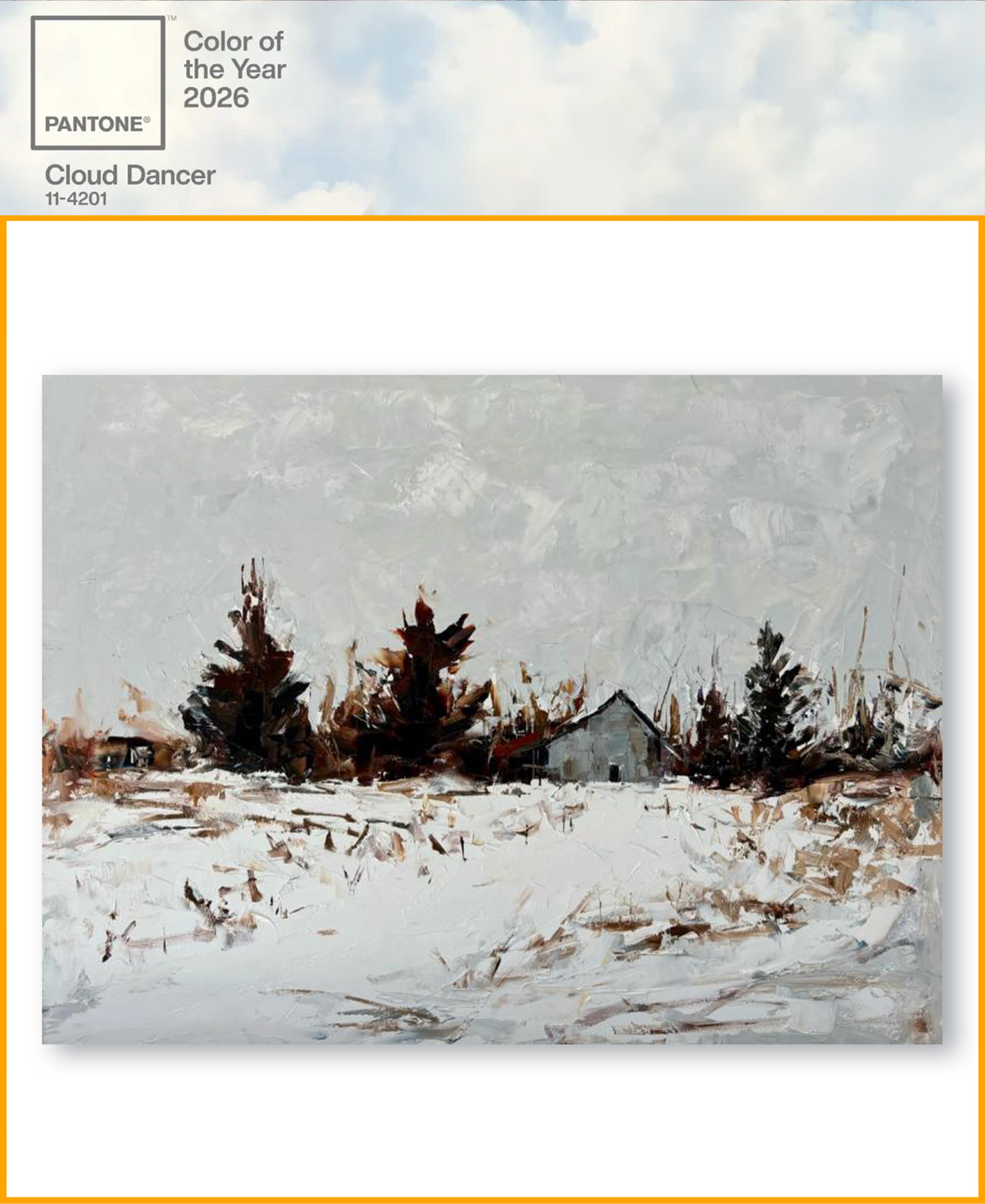 Across “Winter Cabin,” Sandra Pratt uses Cloud Dancer white to define the snowy landscape and textured sky, giving the scene a crisp, luminous quality. The soft, off-white tones guide the eye along the path and through the composition, conveying clarity and balance while underscoring the color’s associations with calm and quiet reflection.