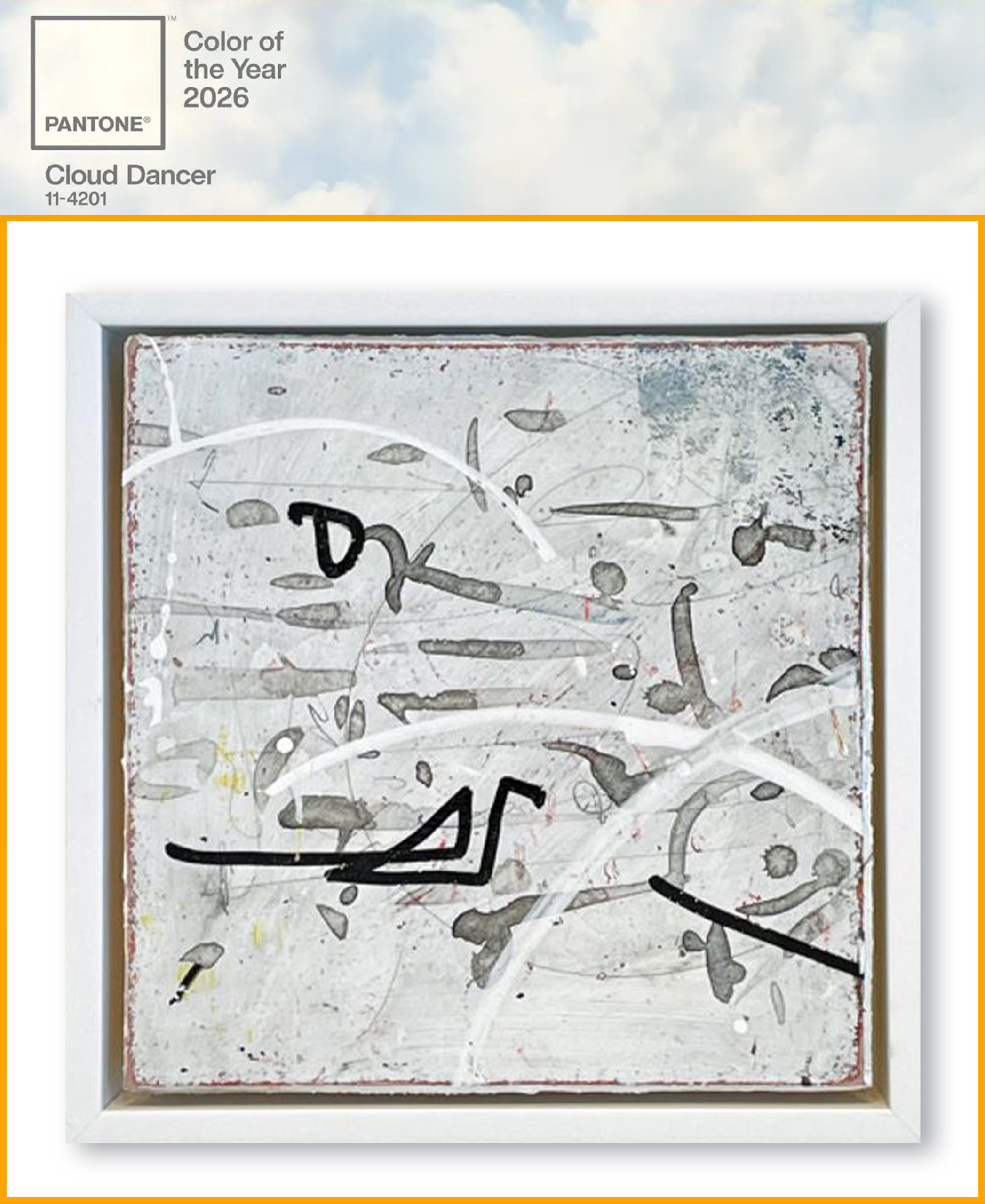 Rather than acting as a backdrop, Cloud Dancer white becomes the primary focus in Shawna Moore’s “Agate,” shaping the encaustic surface with layered movement and depth. Its snowy tonality and subtle gray variations reflect Moore’s nature-driven inspiration, aligning the color with ideas of clarity, peaceful motion, and quiet renewal.