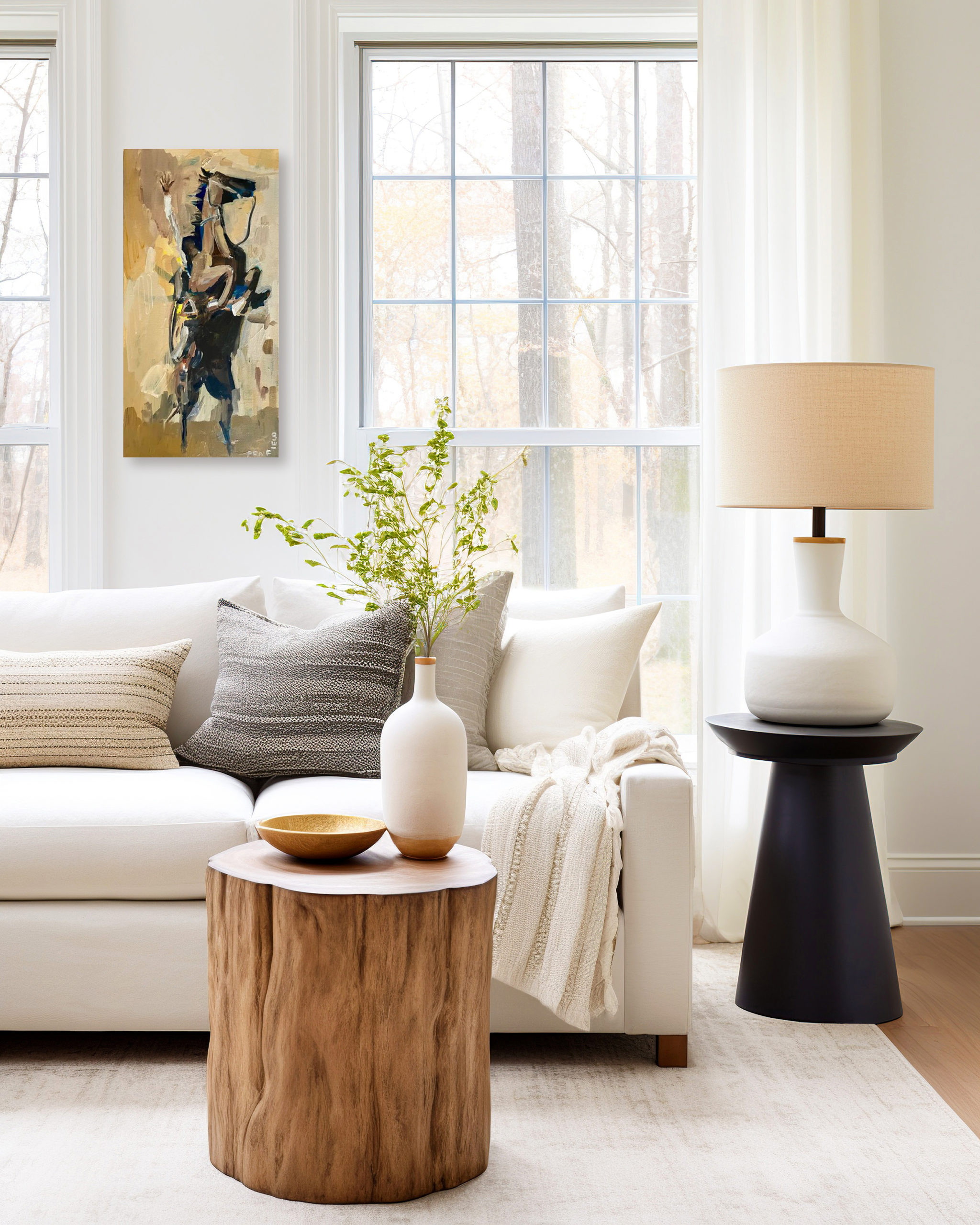 James Penfield’s “Past Lives” animates the bright, airy space with its vertical surge of equine energy, the bucking horse bringing a sense of height and momentum that feels perfectly suited to the narrow stretch between the windows. Its warm, ochre backdrop adds a vivid counterpoint to the room’s soft, textural warmth, allowing the horse’s gestural power to stand out without overwhelming the space. The subtle suggestion of the rider amplifies the painting’s sense of movement, making it a lively focal point that enlivens the serene setting.