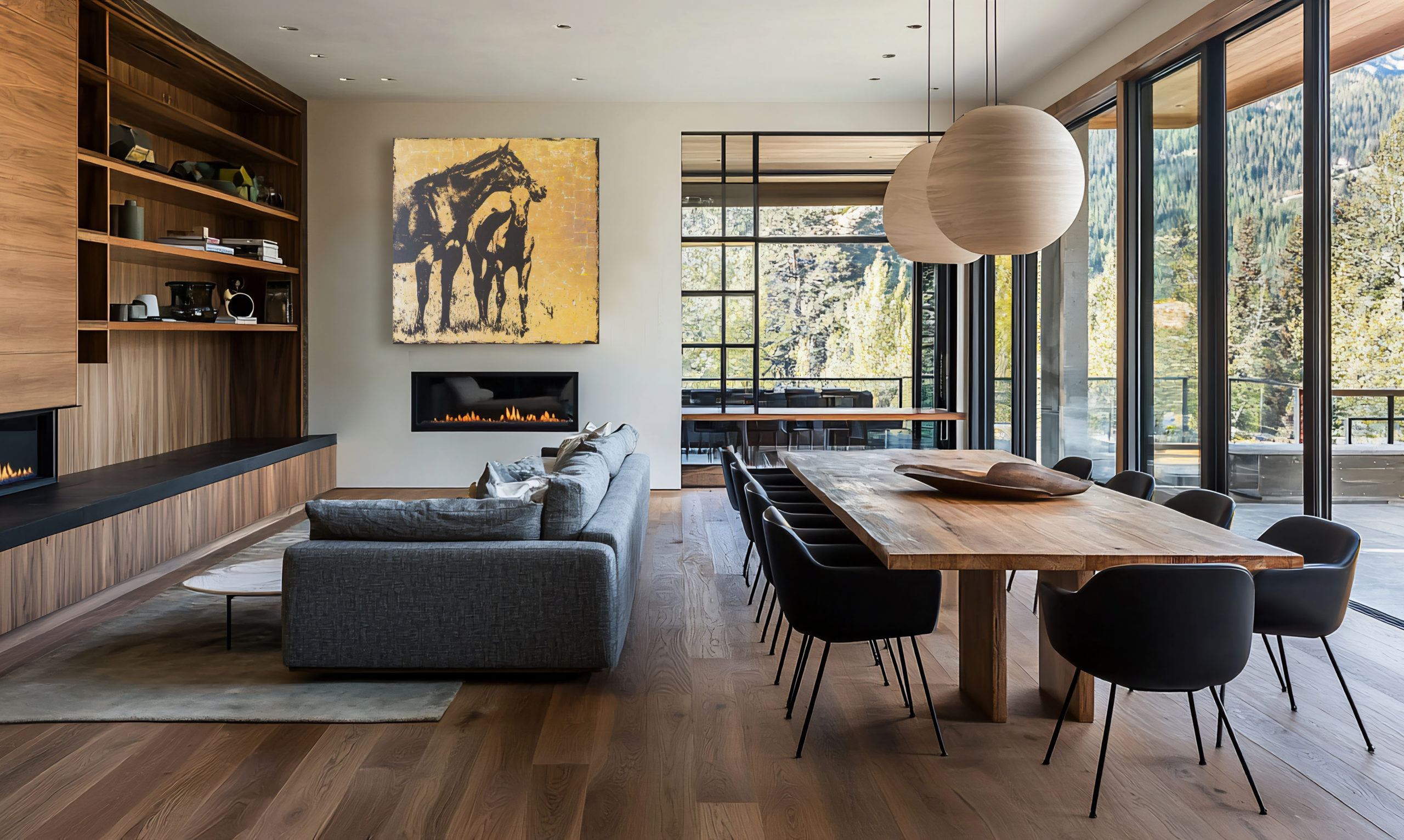 Miles Glynn’s piece brings a striking sense of balance and warmth to the modern fireplace setting, its bold equine silhouettes adding both presence and personality to the open, inviting space. The work’s graphic clarity and rich, sun-soaked tones echo the room’s natural glow, allowing the horses to feel both grounded and effortlessly at home. Their quiet strength becomes a focal point that ties the airy living and dining areas together with an unmistakable “Westernish” charm.