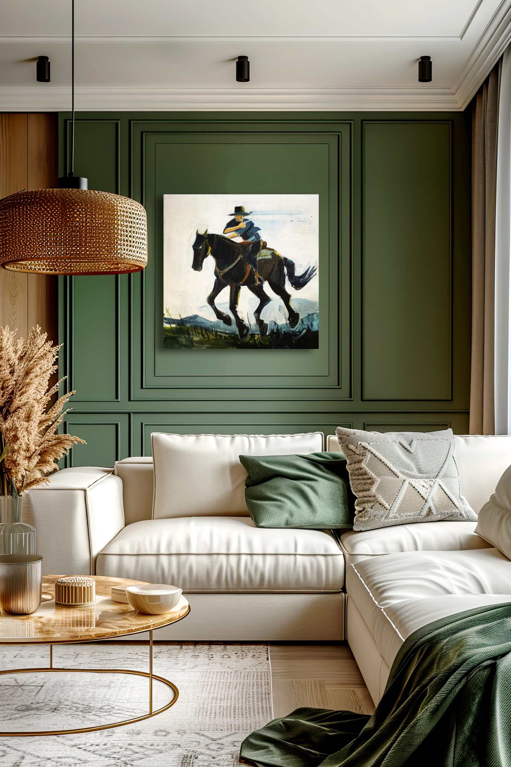 James Penfield’s “High Valley Rebel” infuses the stylish room with a dynamic sense of motion, its energetic brushwork and bold equestrian presence creating a striking counterpoint to the room’s calm, collected palette. The piece’s expansive light-filled backdrop allows it to pop beautifully against the richly colored wall, highlighting how equine artwork can take on new vibrancy in more saturated or character-filled spaces. Here, the horse and rider feel both commanding and seamlessly integrated, their forward momentum adding a touch of spirited rebellion that enlivens the room’s refined warmth.