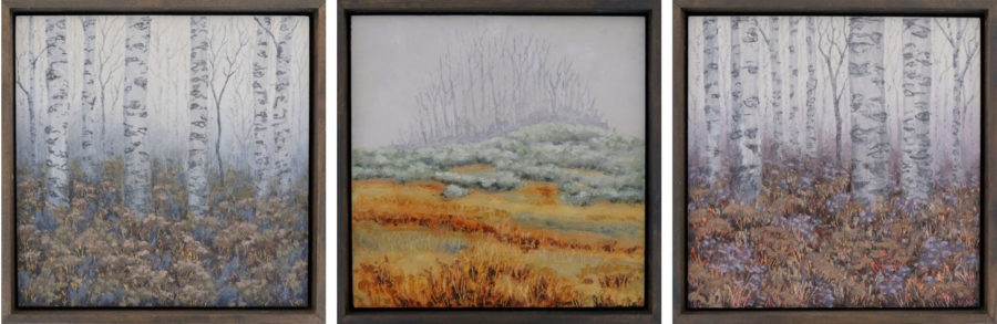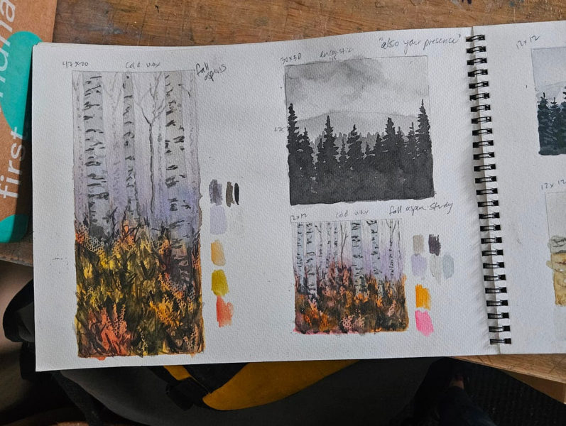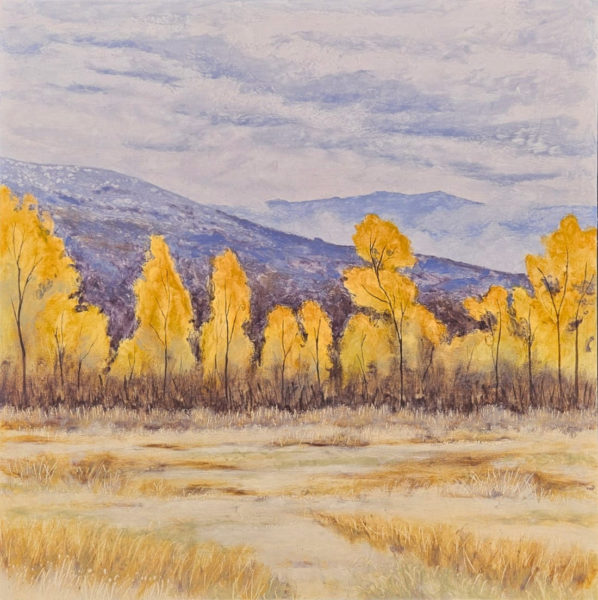 I needed to see if I could make some works dedicated to aspens. Living in an aspen grove, I stare at their trunks hourly, seeing them, watching me in return. Aspens are a hard tree to paint, being tall and spindly, and individual trees are often awkward. They are better viewed as a collective, and in fact they are – each tree a shoot of the same clone.
