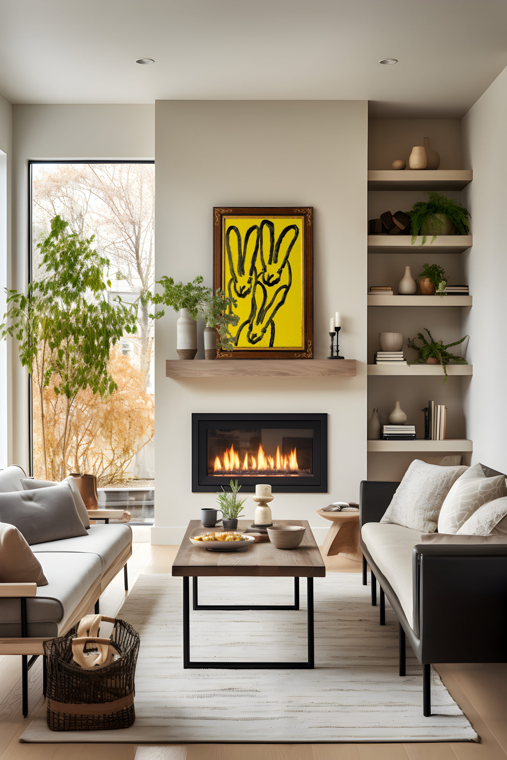 Hunt Slonem’s “3 Range” brings a lively spark to the mantel, its sunny energy lifting a space grounded in soft, neutral tones. The contrast between the work’s playful restraint and the room’s earthy calm creates a focal point that feels both lighthearted and refined. Framed in dark wood, the piece adds just enough structure to balance its buoyant spirit, settling comfortably into a setting defined by warmth and thoughtful simplicity.