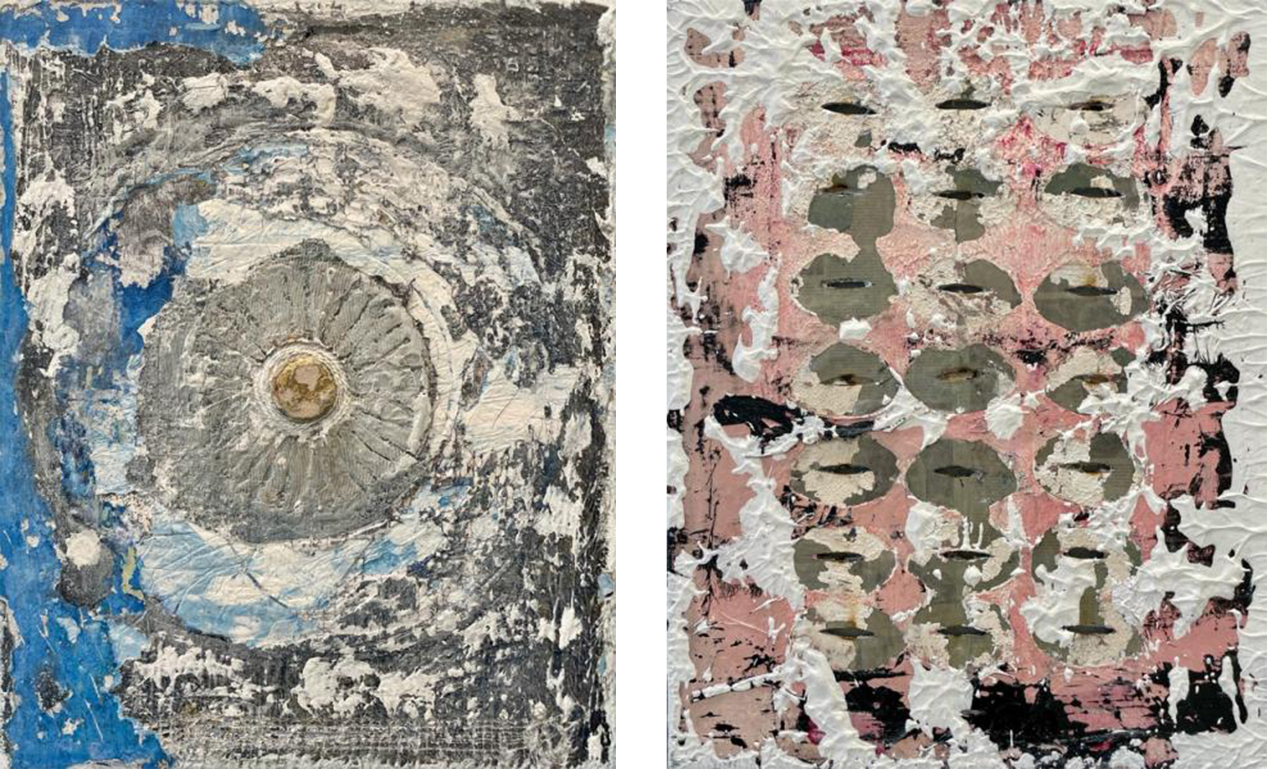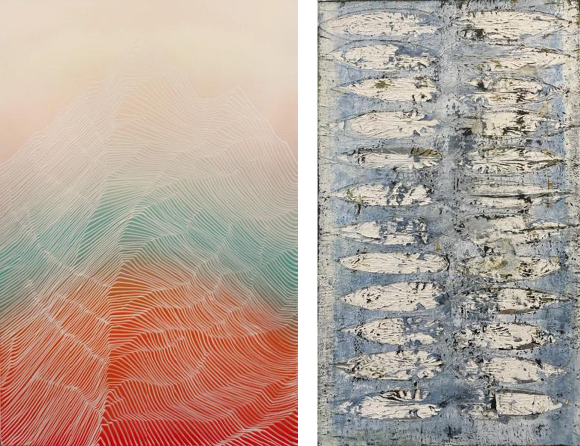 Havoc Hendricks, “You Can Find Me Here,” mixed media, 60″ x 40″ | Samantha Da Silva, “Sacred Imprint,” mixed media, 60″ x 36″