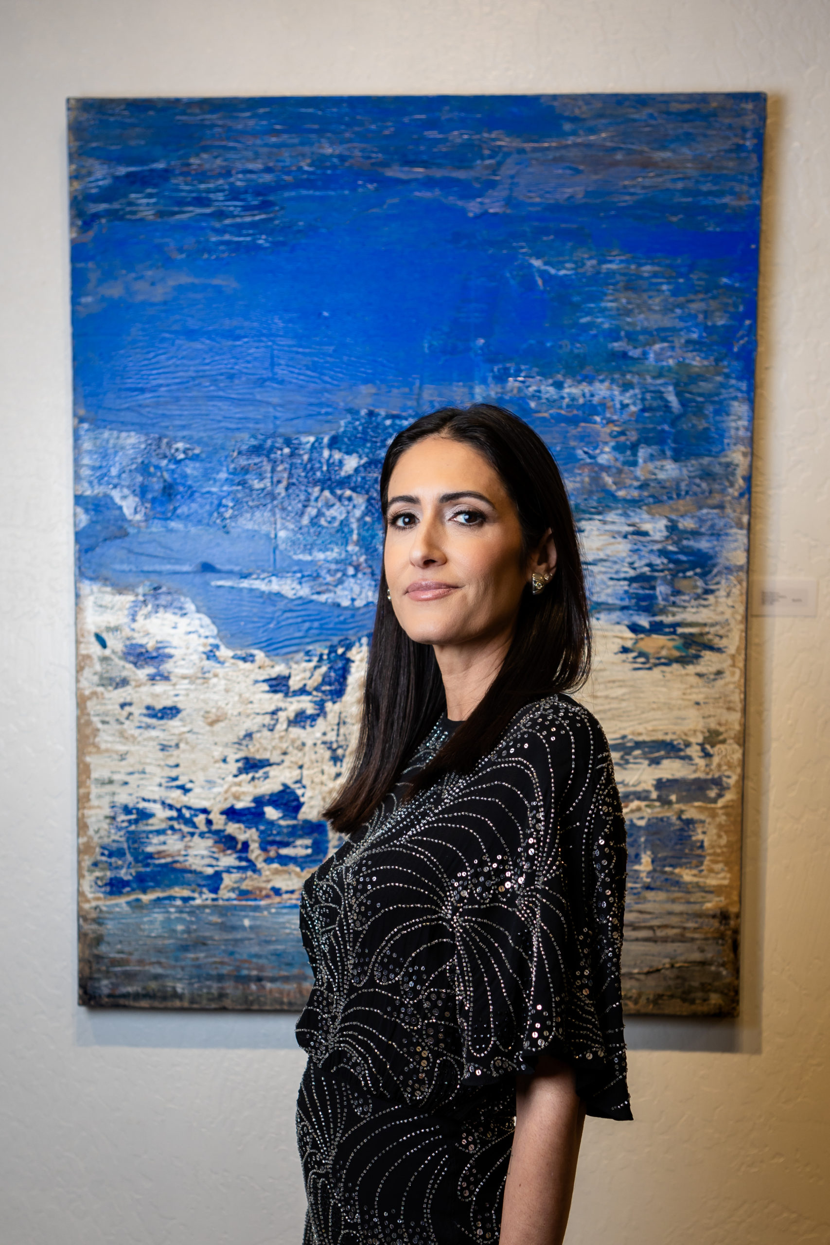 Samantha Da Silva in front of her work, “Blue Horizon,” at her exhibition opening