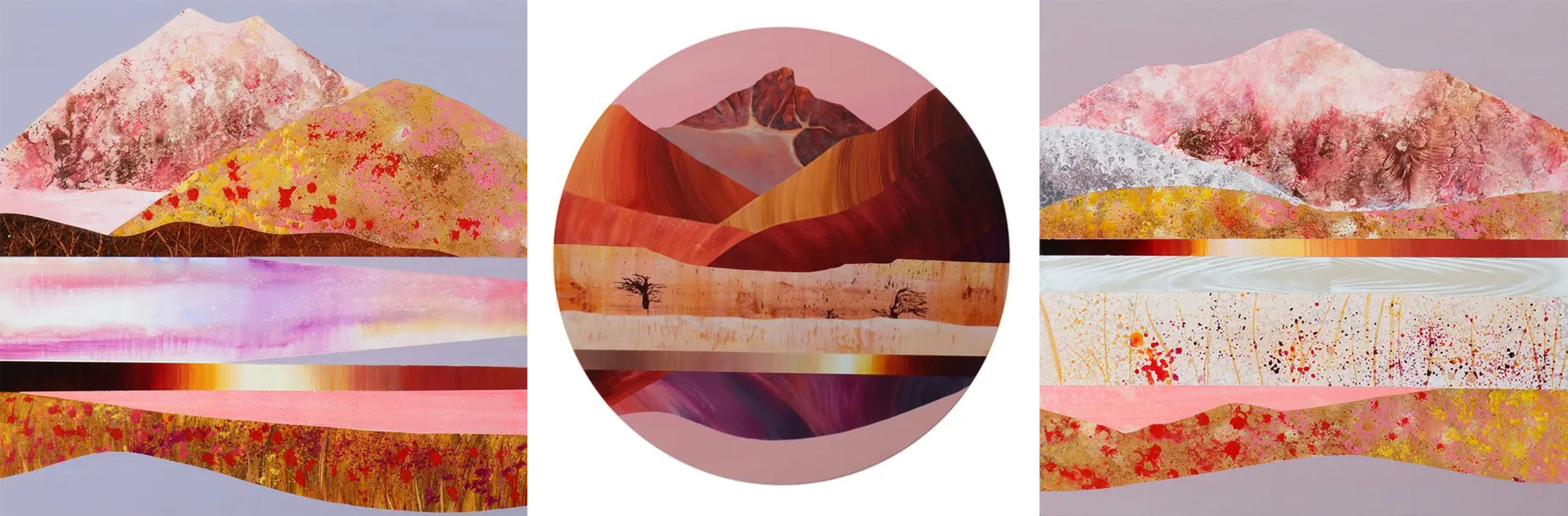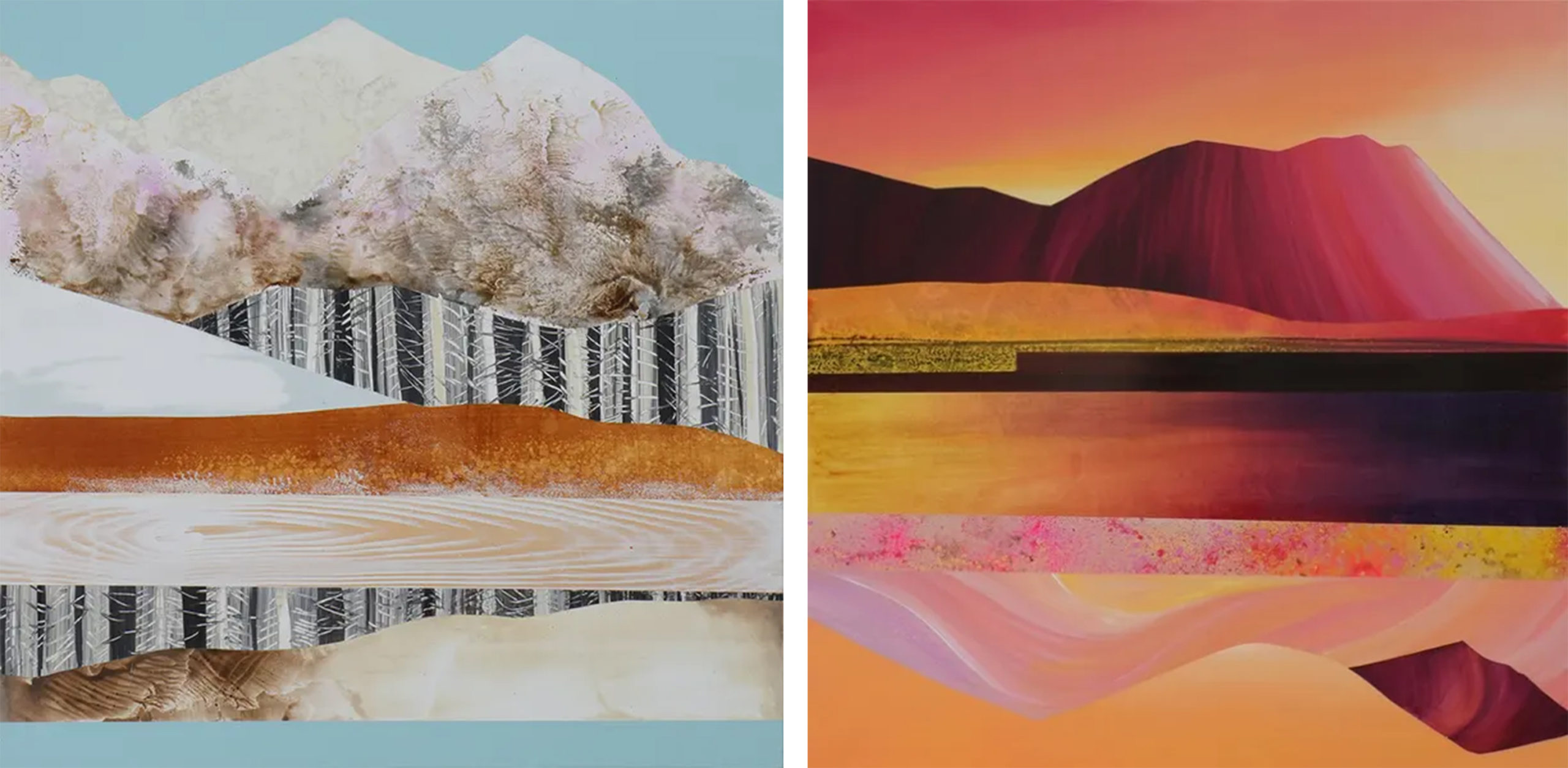 Left to Right: Sarah Winkler, “Snowy Aspens,” acrylic, 20″ x 20″ | Sarah Winkler, “Coachella Valley Oasis,” acrylic, 30″ x 30″