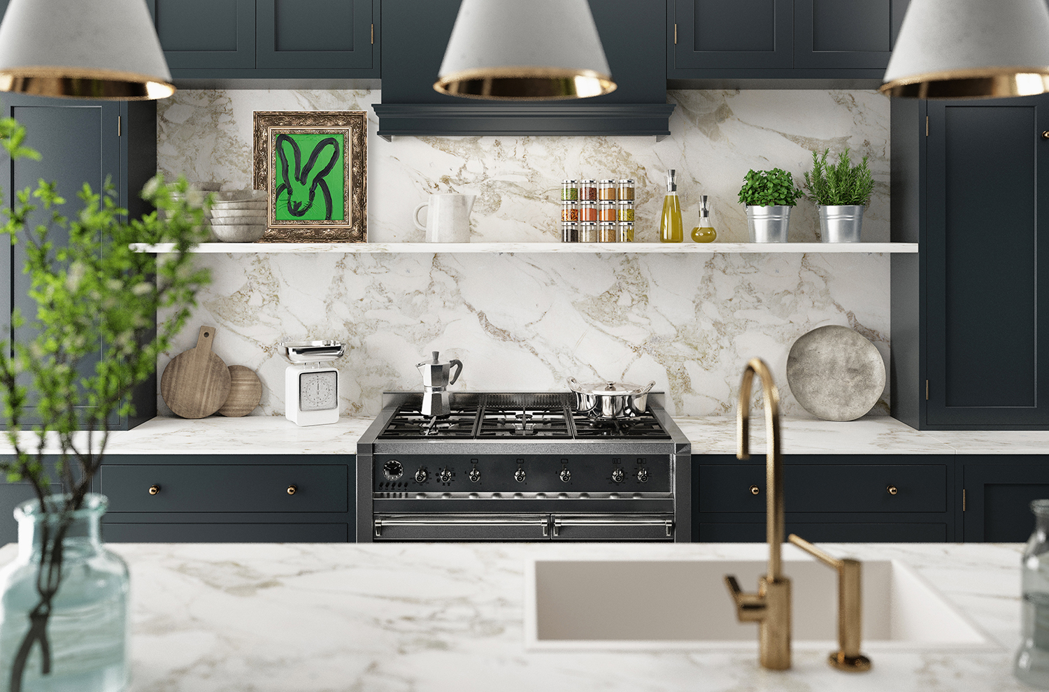 Perched just above the stove, “Land Rover“ by Hunt Slonem brings a playful pulse of color and personality to the space. Its vivid clover-green nods subtly to the spirit of St. Patrick’s Day, while the lively bunny subject feels perfectly aligned with the sense of renewal and lighthearted energy that comes with early spring. The piece’s crisp lines and compact scale make it an effortless fit in a clean, contemporary setting, where a small but spirited artwork can quietly steal the show.