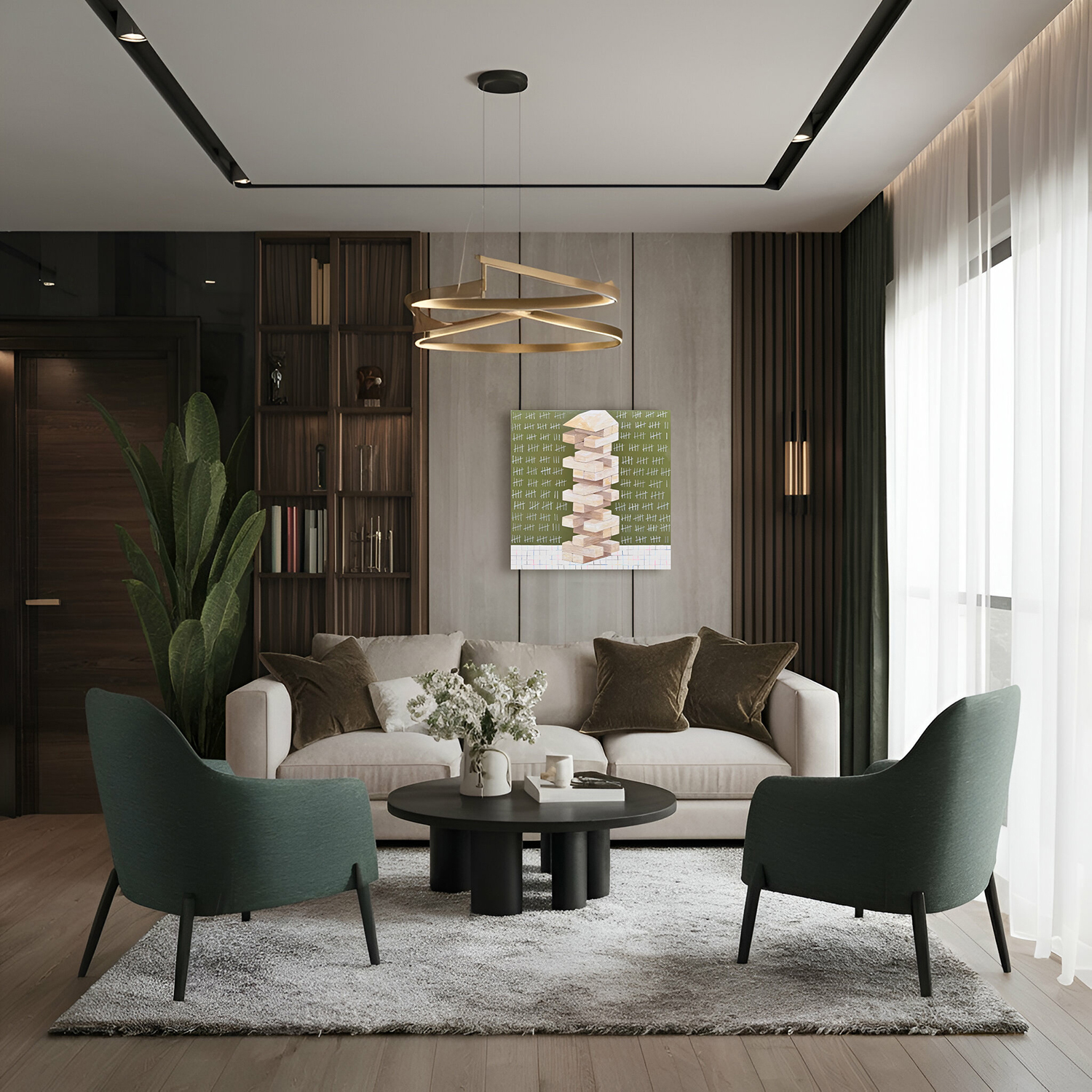 With its olive-green palette and playful narrative, “In the Balance“ by Sara Edgar brings a quiet sense of wit and intrigue to the living space. Edgar’s work often pairs approachable imagery with deeper undertones, inviting viewers in through whimsy while hinting at the subtle negotiations and scorekeeping that shape everyday life. Here, that clever balance feels especially fitting for the season. The lively green backdrop nods gently to St. Patrick’s Day, while the precarious stack suggests the playful gamble of luck itself, making the piece feel both sophisticated and delightfully tongue-in-cheek within the room’s cozy, refined atmosphere.
