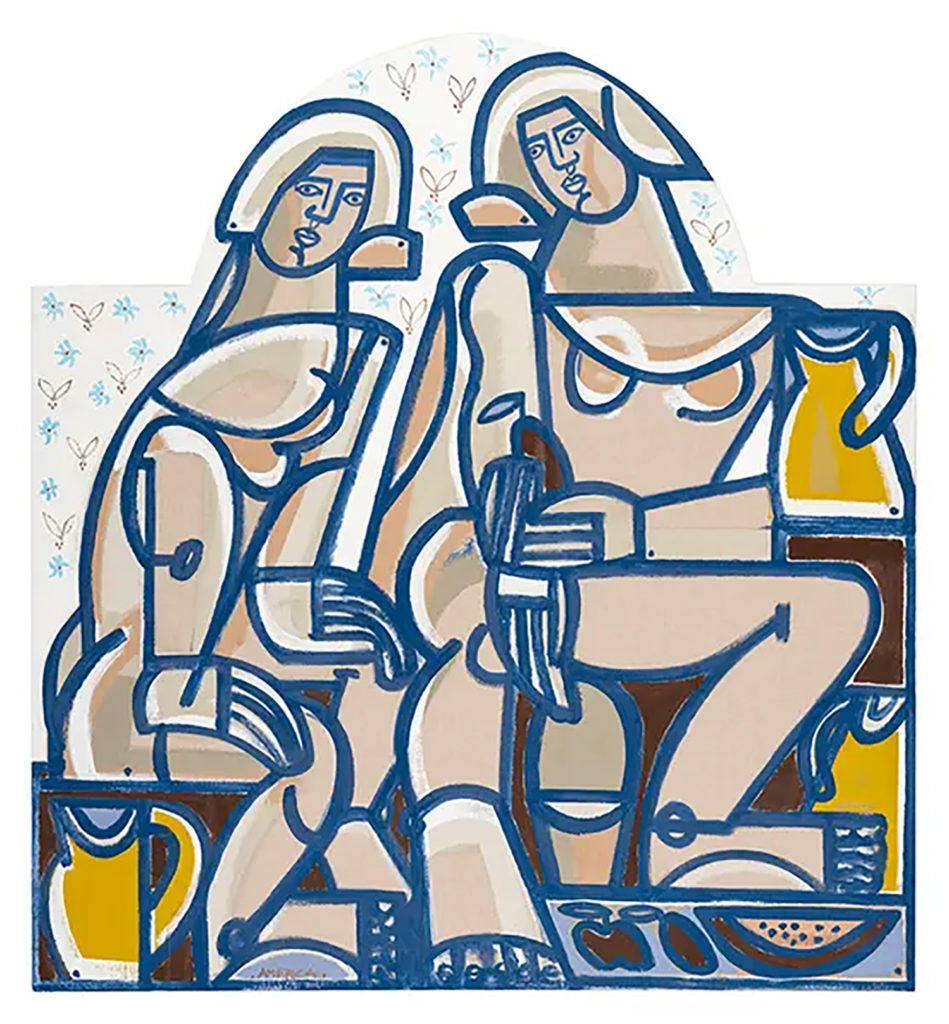 America Martin, “Under the Pear Tree Maidens & Clay Pitcher,” oil and acrylic, 65″ x 60″