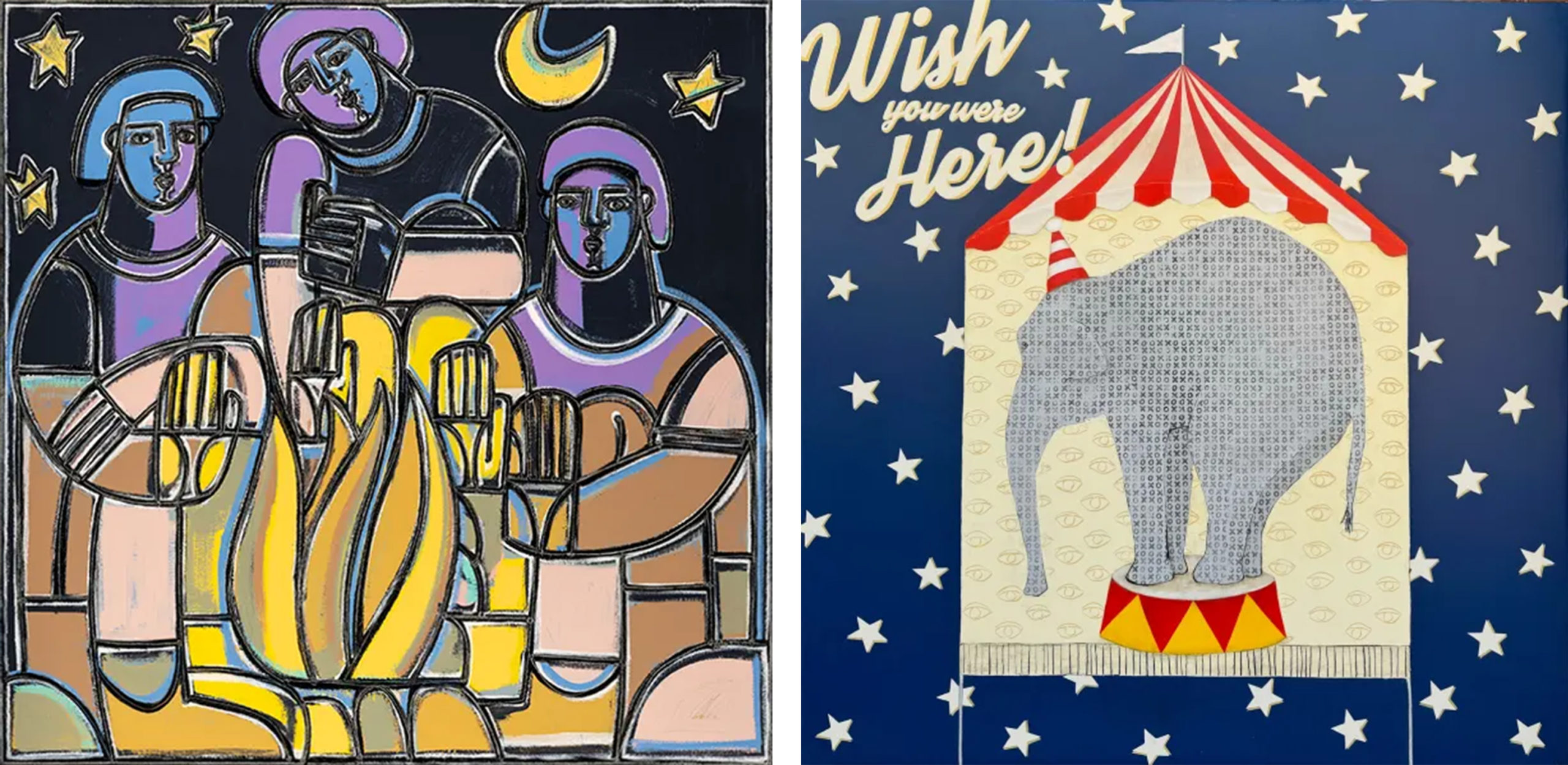 Left to Right: America Martin, “Campfire,” mixed media, 59.25″ x 59.25″ | Sara Edgar, “Postcard #3 (Big Top),” acrylic, 48″ x 48″