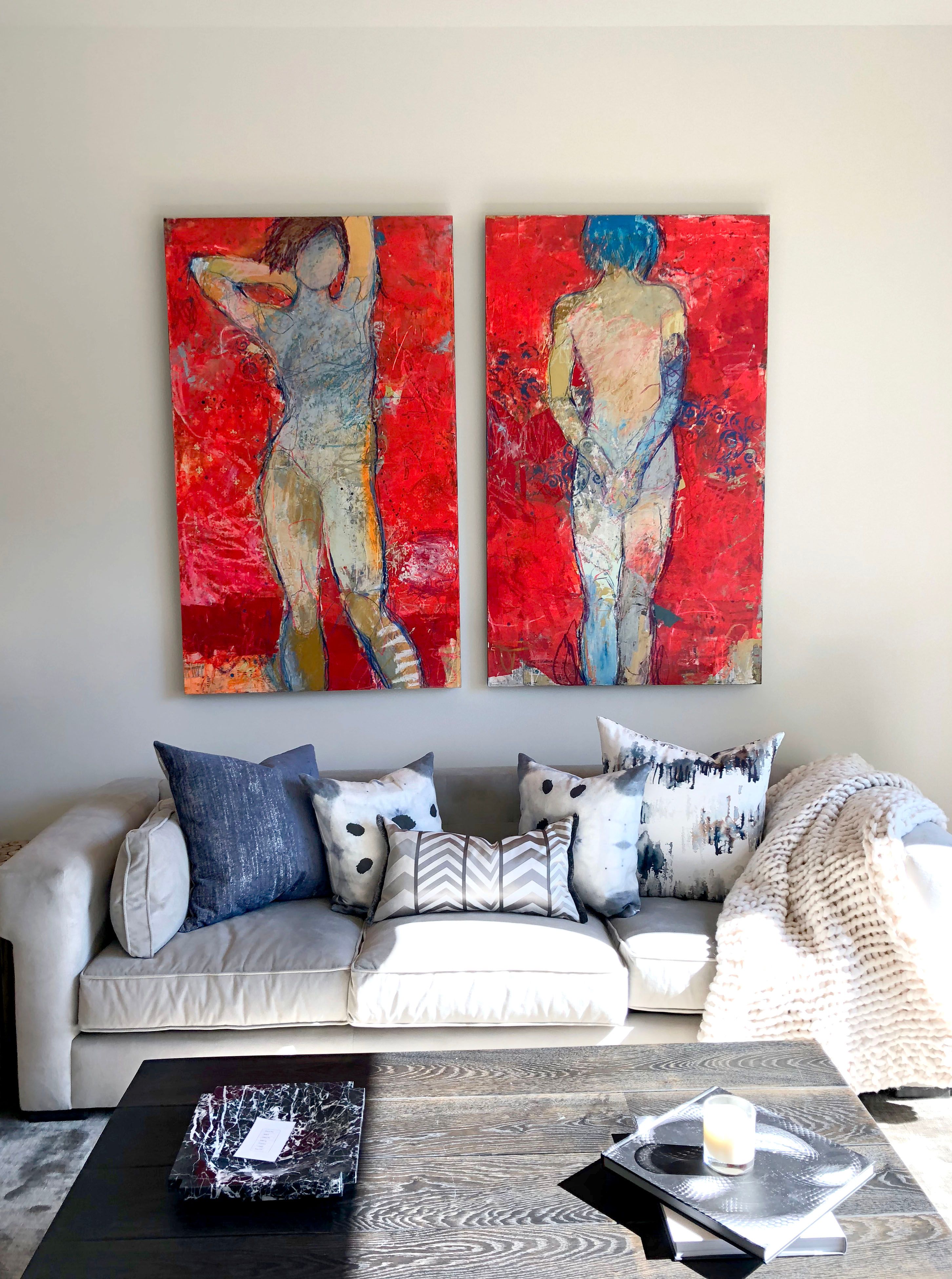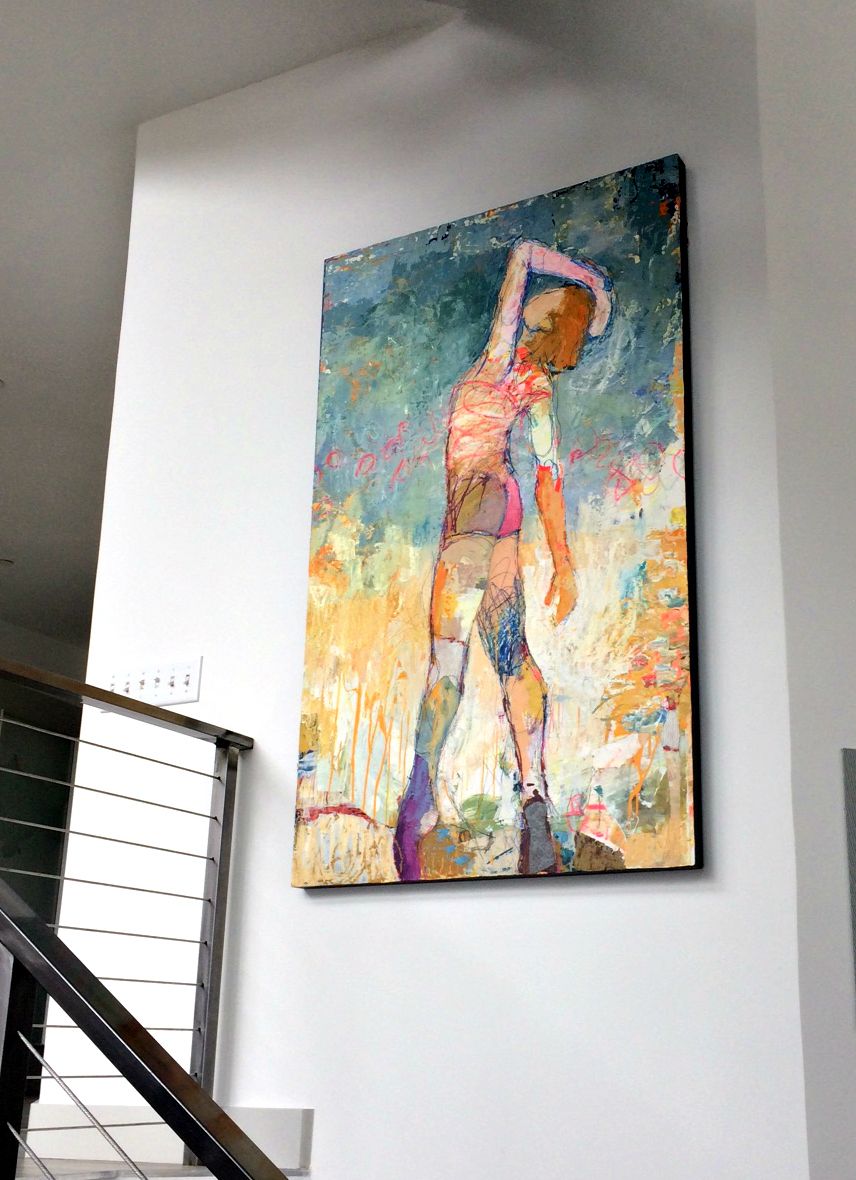 Favoring oil and acrylic paints, charcoal, wax, gold leaf, pastel, and graphite, Gustlin draws, paints, and even scratches on the surfaces of her compositions. Many of her paintings resemble sculptures, an influence from figurative artists such as Nathan Oliveira. “But I’m inspired by everything,” she adds, including her own beloved nieces and nephews. “I first learned my scratching technique from them.”