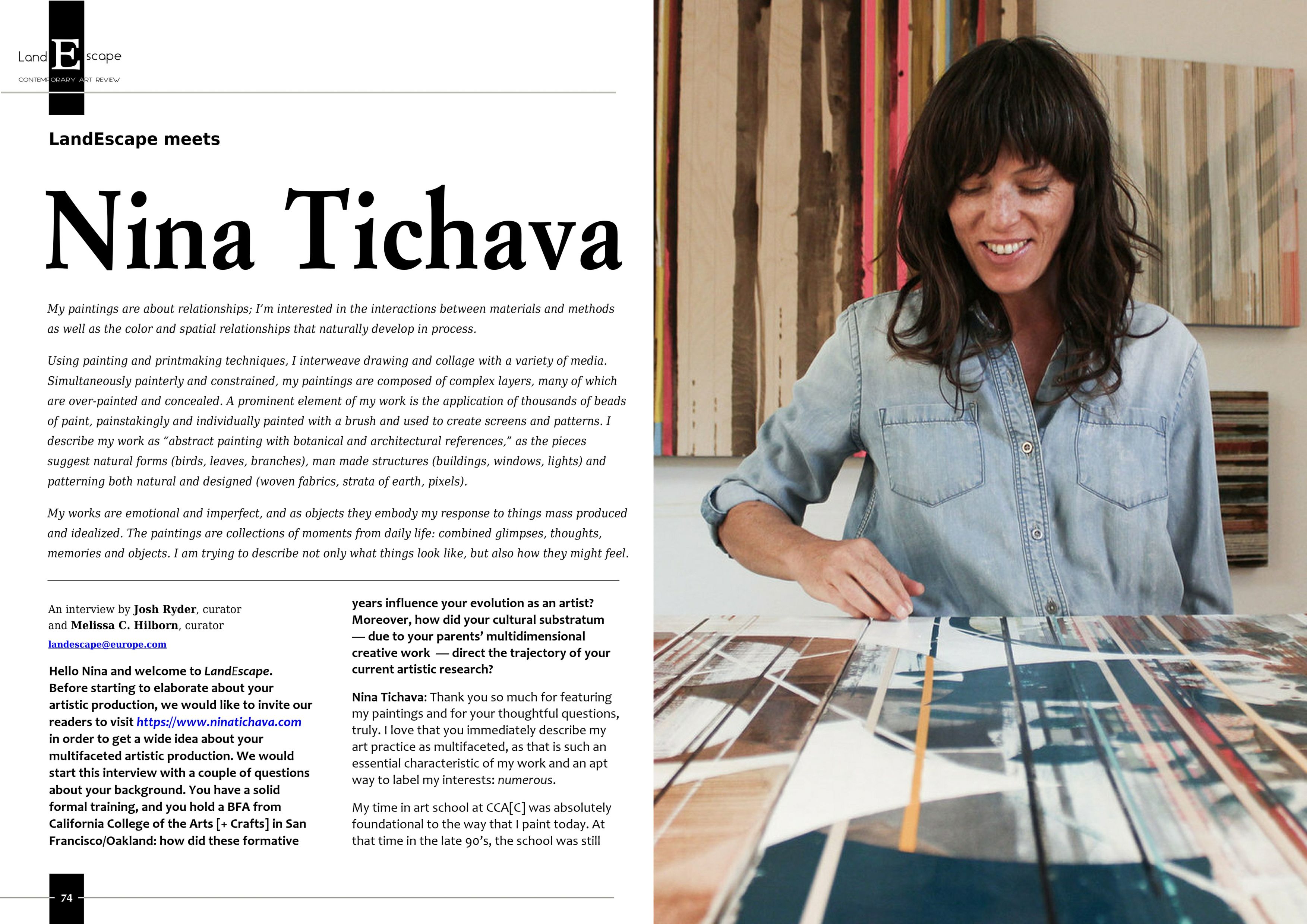 Nina Tichava was raised in both rural northern New Mexico and the Bay Area in California. She was influenced by her father, a construction worker and mathematician, and her mother, an artist and designer. The reflections of these dualities: country to city, pragmatist to artist, nature to technology, are essential to and evident in her paintings.Nina Tichava received her BFA from California College of the Arts [+ Crafts]. She lives and works in New Mexico Nina is a recipient of the Pollock-Krasner Foundation Award Grant in 2007 and has exhibited professionally since 2009.
