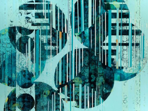 My process-based paintings are as unplanned as possible. I search to convey a feeling of immediacy and to enhance the very physical and tactile elements of my artwork. The presence and feeling of my hand is essential to the work and ultimately my focus. Using painting and printmaking techniques, I interweave drawing and collage with a variety of media. Simultaneously painterly and constrained, my paintings are composed of complex layers, many of which are over-painted and concealed. A prominent element of my work is the application of thousands of beads of paint, painstakingly and individually painted with a brush and used to create screens and patterns. I describe my work as “abstract painting with botanical and architectural references”, as the pieces suggest natural forms (birds, leaves, branches), man-made structures (buildings, windows, lights) and patterning both natural and designed (woven fabrics, strata of earth, pixels).