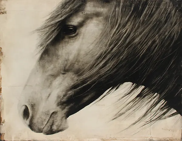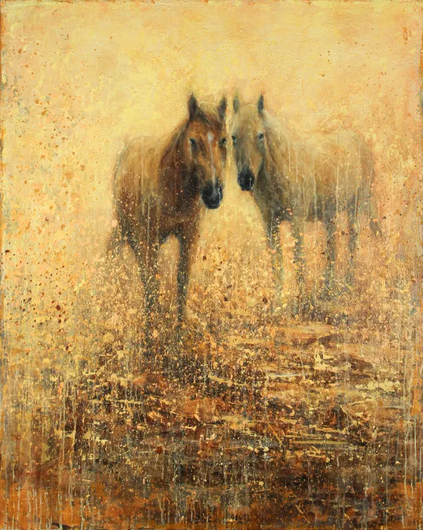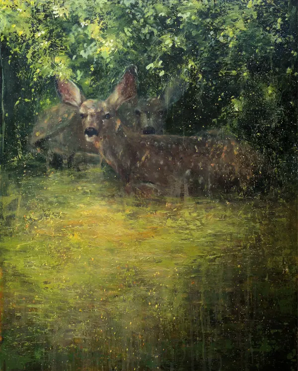 Textural, earthy patina is contrasted against flashes of decorative and linear forms to create a poetic relationship between the subjects and their natural surroundings. The subjects in my work are simultaneously emerging from and being dissolved into an ever changing environment.
