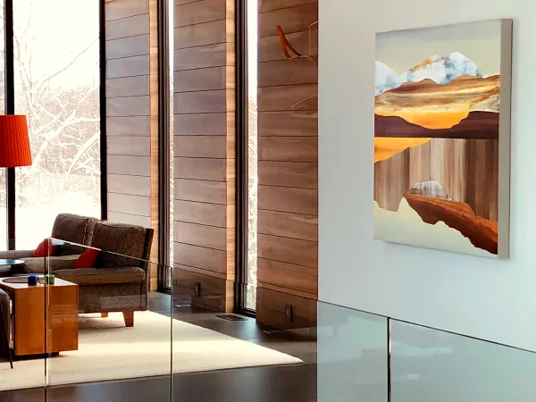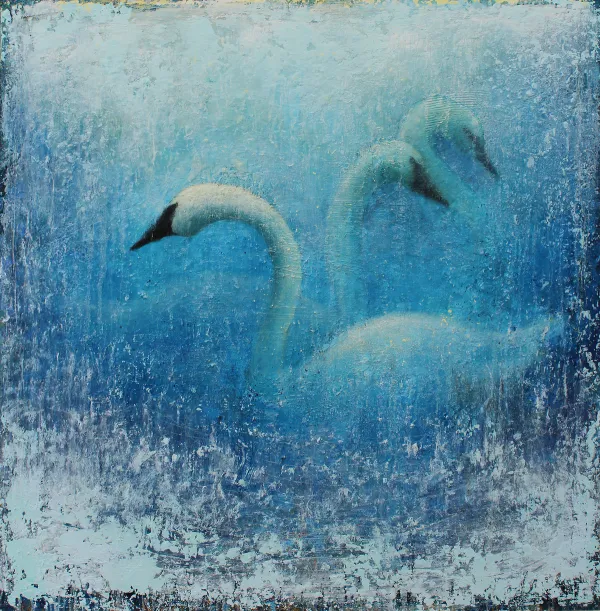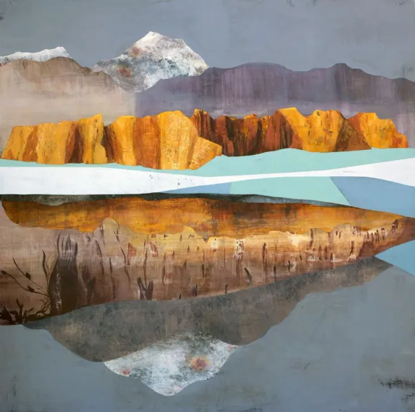 The theme "Embodied" highlights the physical and emotional connections we have with our environment. Using encaustic and cold wax, both made with beeswax, Meinhold creates depth through various techniques, exploring the landscapes she cherishes. The tactile nature of these mediums allows for a visceral response, encouraging viewers to imagine themselves physically within the landscape. By immersing yourself in this atmospheric world, you can be present in the moment and connect with the here and now.